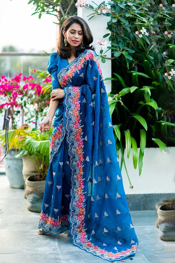 A fancy organza saree is perfect for cultural celebrations and traditional events. Embrace the richness of traditional Banarasi motifs and elaborate zari work for a regal appearance.