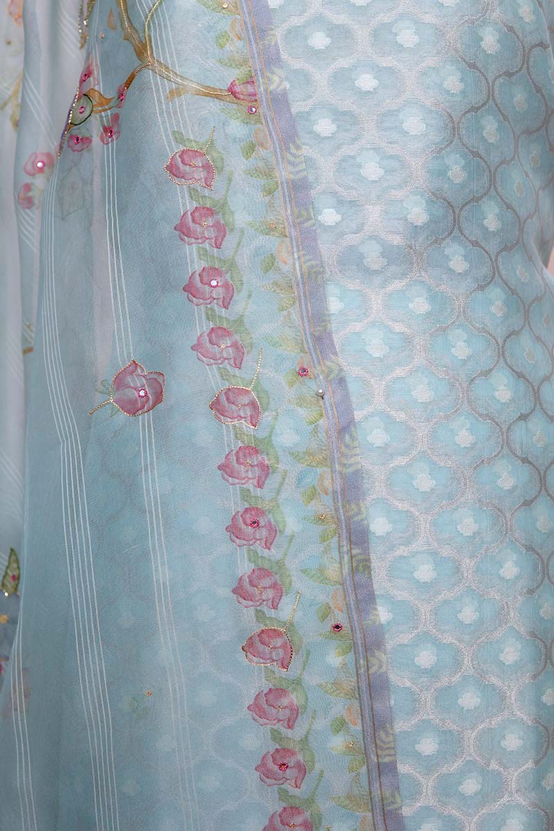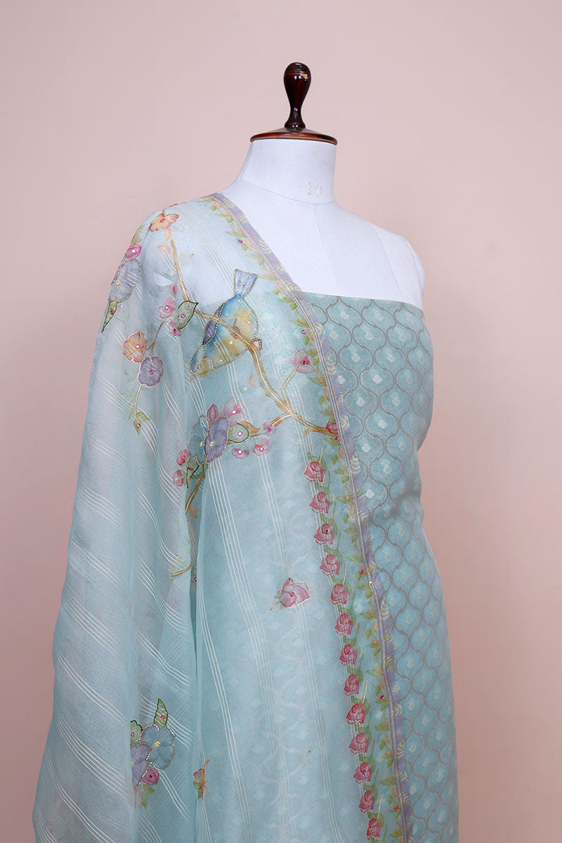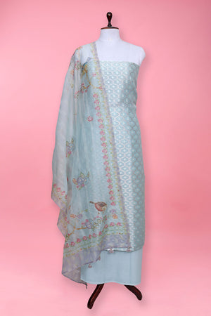 Immerse yourself in sheer brilliance with this eye-catching dress material. Featuring a silver zari woven geometrical jaal, resham woven butis, and a beautiful organza silk dupatta with digitally printed floral motifs and aari work, it is a wardrobe must-have. The lightweight, quality tissue silk fabric ensures comfort. Embrace enchantment and make a statement of unrivaled style.