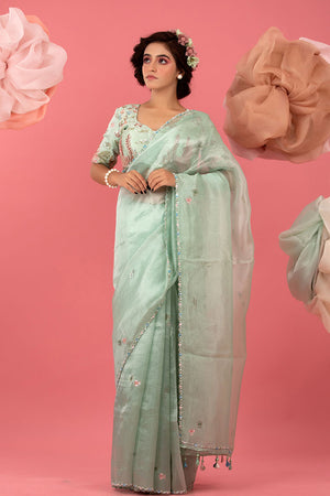 Unveil your inner diva with our chic silk saree. Its modern design, lightweight tissue silk fabric, and unique colour palette make it perfect for both formal events and casual gatherings. It has an embellished fish motif buta all over and a scalloped border that uplifts its overall look. It comes with stitched blouse piece. Wear it with matching gold jewellery to reveal your stylish side.