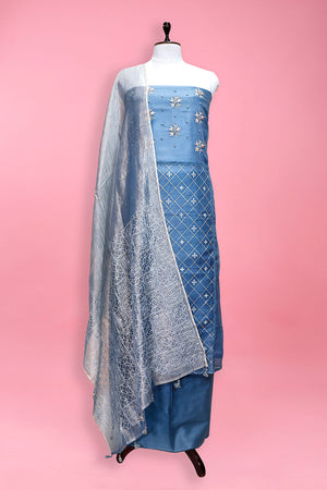 Mesmerize the onlookers with a dress created from this beautiful blue-colored organza silk dress material. Light in weight and comfortable to wear, this dress material has a stunning finish that cannot be missed. The distinct floral zardozi embroidered butas on the neckline with added lace and geometrical sequined embroidery all over adds to its overall appeal making it a worthy buy.