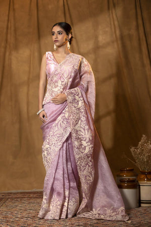 This baby pink Banarasi silk saree features an intricately woven resham silk border with crushed tissue threads, showcasing beautiful bird and floral patterns. The design extends to the pallu, adding a harmonious and artistic touch to the saree. It comes with a matching running unstitched blouse piece, allowing for custom tailoring to suit your style.