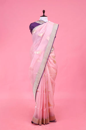 Introducing our appealing baby pink handloom organza silk saree, a perfect blend of tradition and modern elegance. Adorned with delicate gold zari handwoven bird motifs buta all over the saree, it exudes a playful charm. The gold zari handwoven contrast on the pallu and border feature, adding a touch of regal allure. Pair this with a contrast unstitched blouse piece that comes along with this saree and chunky silver jewelry. Flaunt this saree at any event and pull off the compliments from your dear ones.