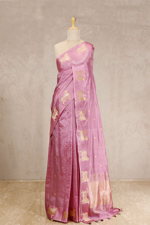 This Baby Pink Banarasi silk saree is a handloom masterpiece featuring gold and silver zari woven Pichwai Aghanya (cow) motifs across the body woven with pure Puna silk. The saree is accentuated with a silver and gold zari-striped border on a satin base and complemented by an ethnic brocade pallu. It comes with a matching unstitched blouse piece for custom styling.
