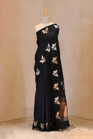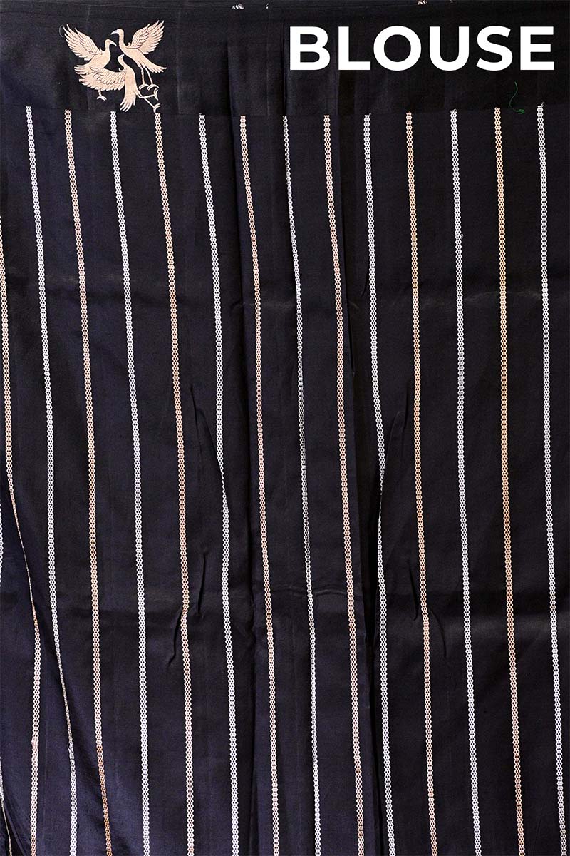 This Black Puna Banarasi silk saree is woven with a dense thread count, offering a smooth texture. The body displays Roopa Sona (Gold and Silver) 6 kali zari floral buti spaced evenly on the body! A defining feature is the 5 Kadi satin silk border, detailed with gold and silver zari woven Pakshi (bird) motifs. The pallu presents a contrast with Hand-done (Tie and Dye) Bandhani featuring floral and bird patterns, The saree comes with a matching Zari Striped Blouse