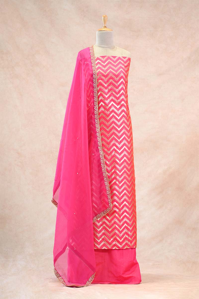 ⦁Styling Tip: The dupatta's plain texture balances the heavy zig-zag pattern of the kurta; drape it over both shoulders for a formal silhouette. Gold-toned Jhumkas or a minimal gold chain to complement the metallic zari stripes. A sleek high ponytail or a straight open look will emphasize the verticality of the zig-zag stripe patterns on the kurta.