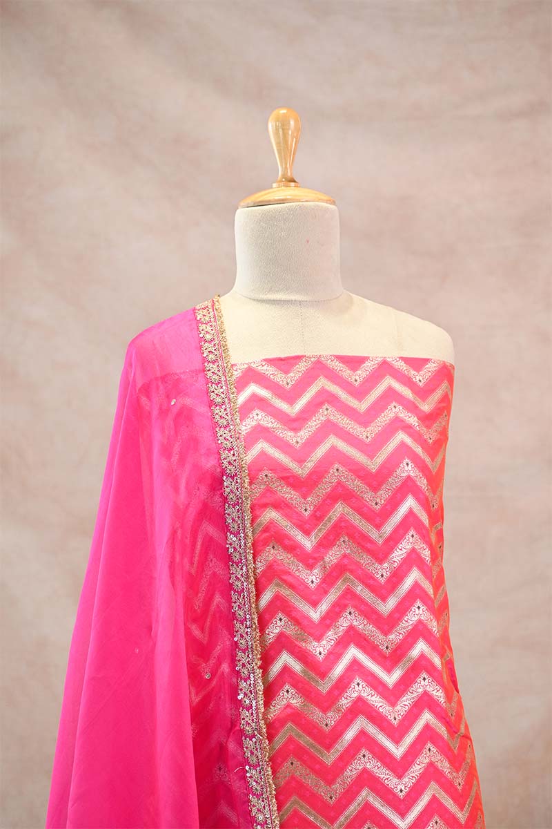 ⦁Motifs/Design: Zari Woven Zig-Zag Stripes with Floral Meenakari Work