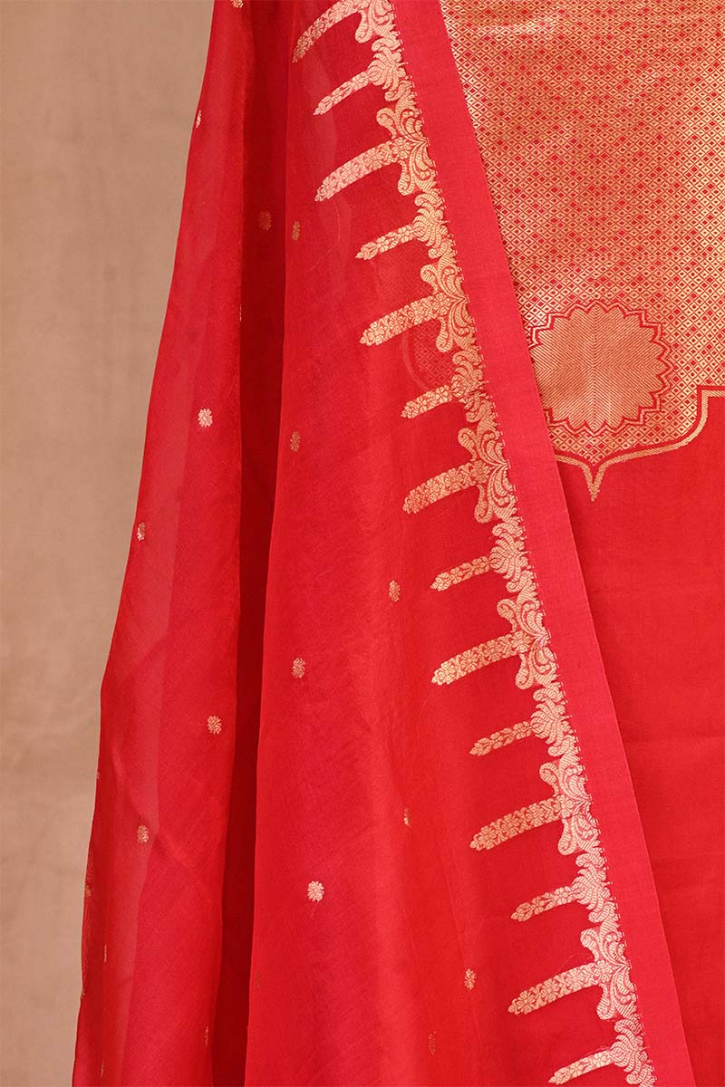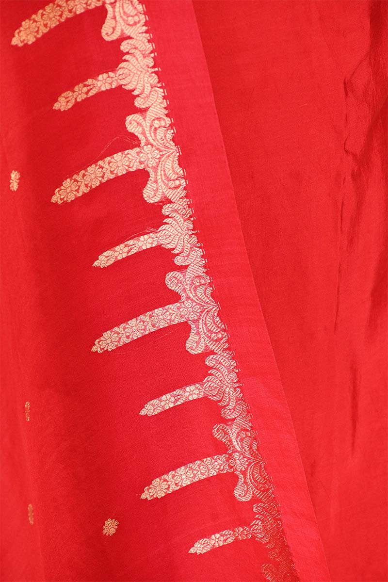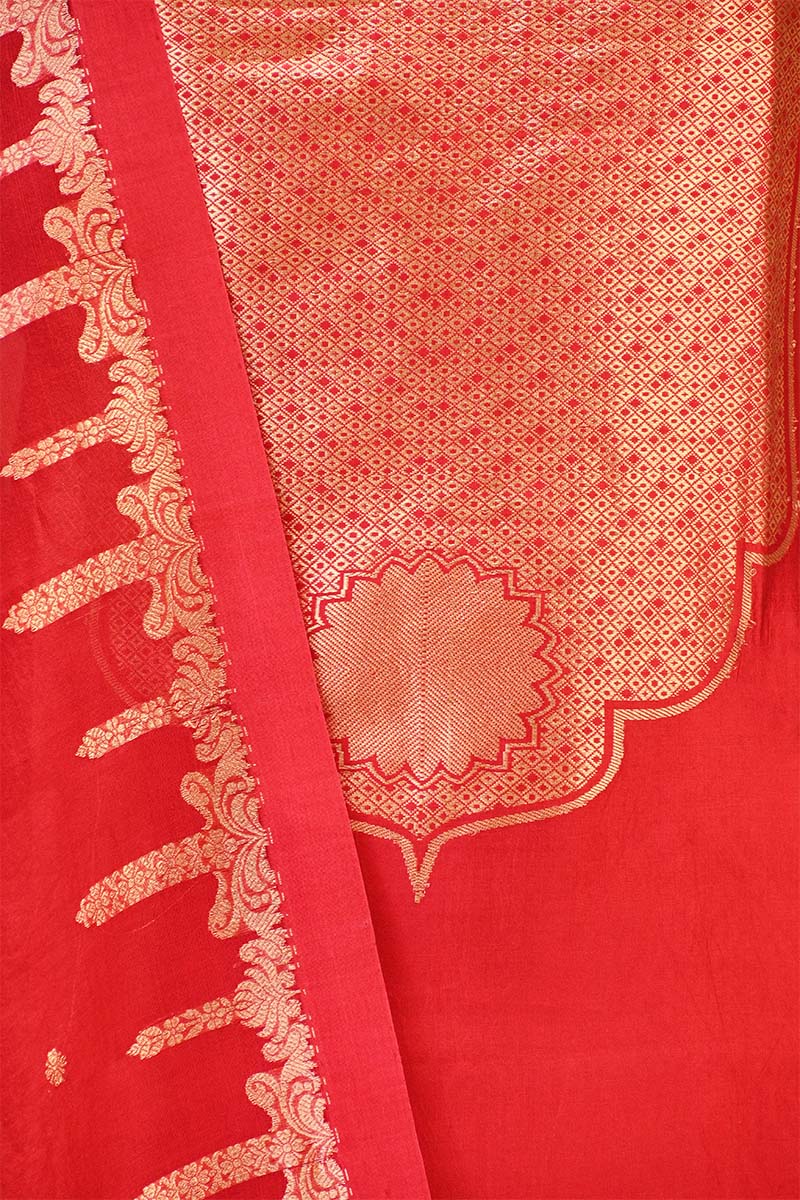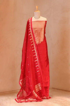 This Red Banarasi Silk suit set features gold zari woven geometrical and floral brocade on the yoke. It is paired with a coordinated green bottom pant fabric that includes a gold zari woven border at the ankle. The set is completed with a Red organza silk dupatta highlighted by gold zari woven floral buti and zari edging along the border.