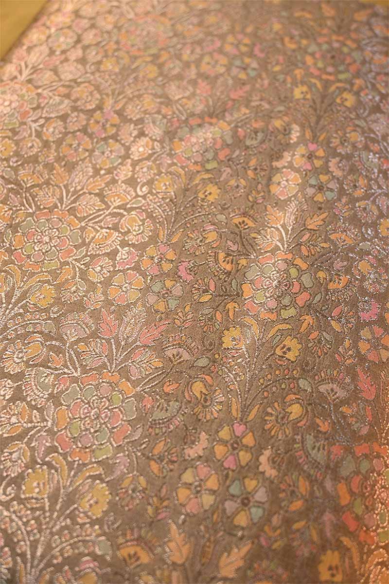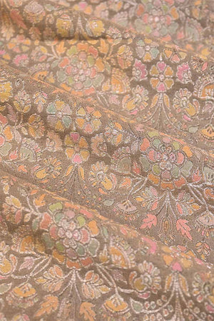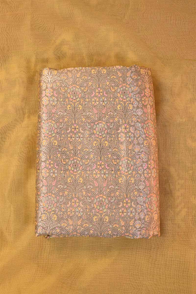 This Beige Chiniya silk fabric features intricately woven floral jaal patterns in silver zari, beautifully enhanced with multicolor meenakari work. The contrast of fine silver detailing and vibrant accents makes it a perfect pick for creating standout blouses or dress pieces.