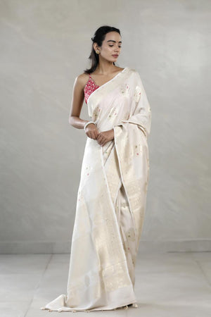 This beige tussar khaddi silk saree is intricately adorned with gold zari and meenakari woven floral buta throughout the body. The border features elegant gold zari paisley and floral motifs, while the pallu is highlighted with ethnic motifs and a geometric zari pattern. It comes with a matching unstitched blouse piece to complete the ensemble.