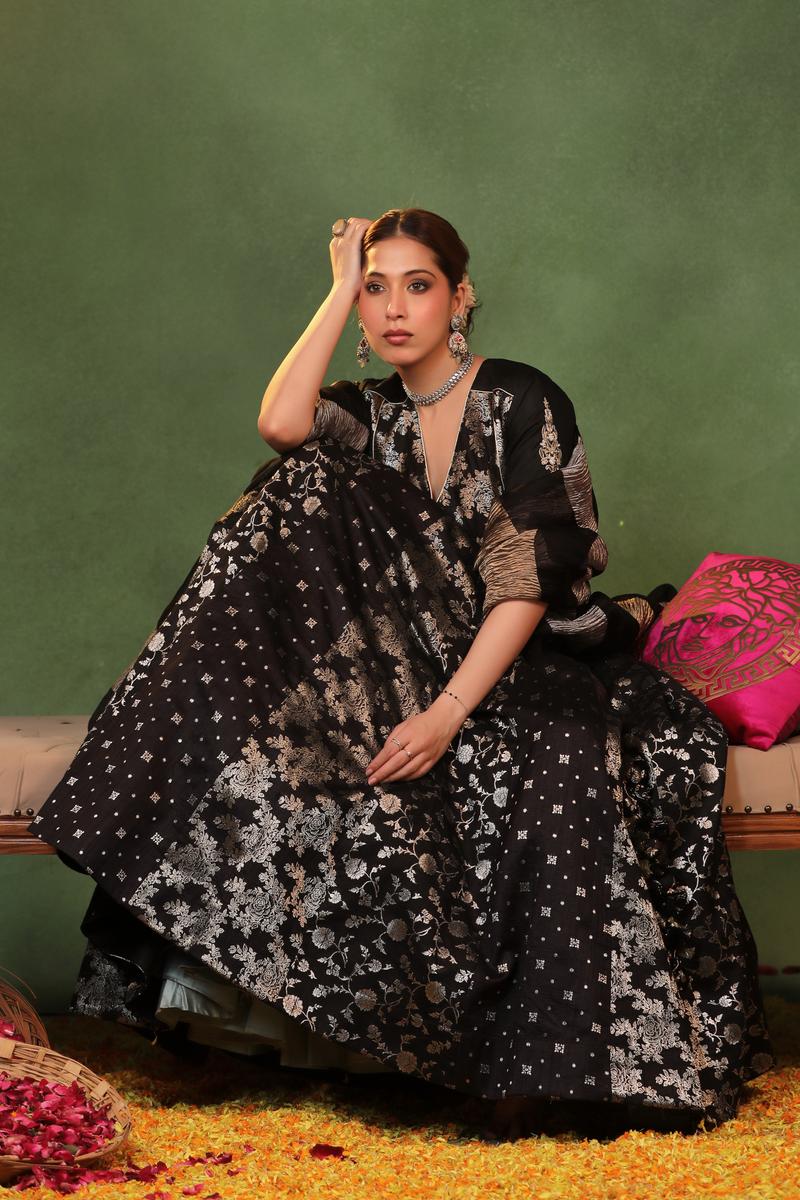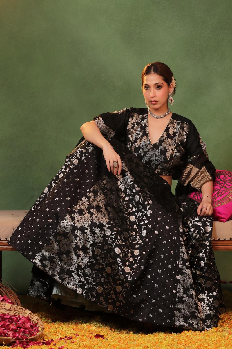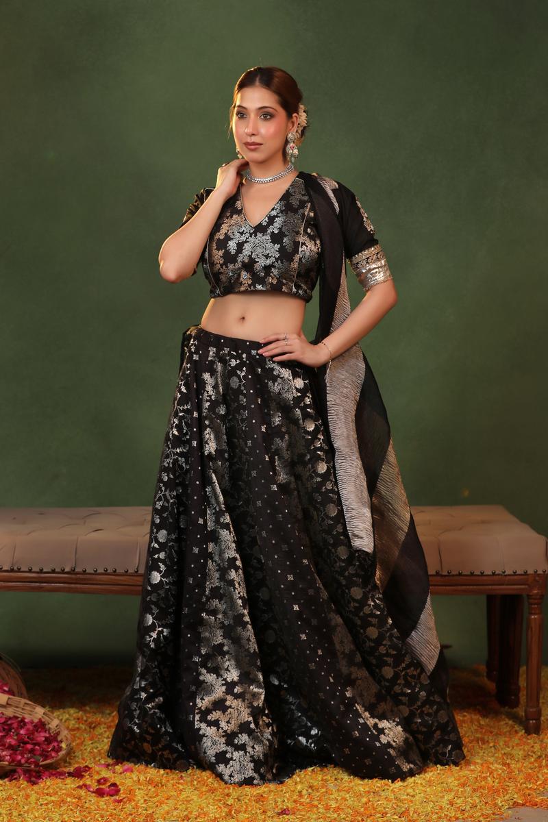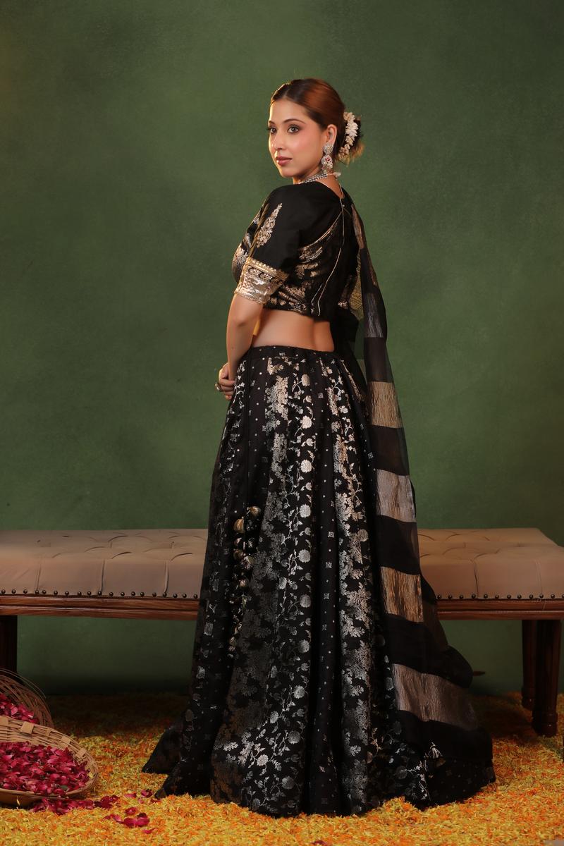 "This black Banarasi raw silk lehenga for women features a classic kalidar design with striking panelled detailing. Each panel is adorned with silver and gold zari woven floral buttis and floral jaal motifs, paired with a matching blouse and an organza tissue silk dupatta for a complete wedding-ready ensemble.