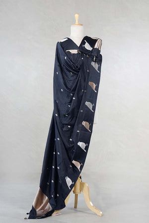 This Black Banarasi silk dupatta features 5 Kadhi satin silk border embellished with intricately woven gold zari bird motifs. The body of the dupatta is designed with 2 Kadhi adorned with exquisite gold zari woven flower buti, while the pallu showcases a stunning gold zari woven pattern.