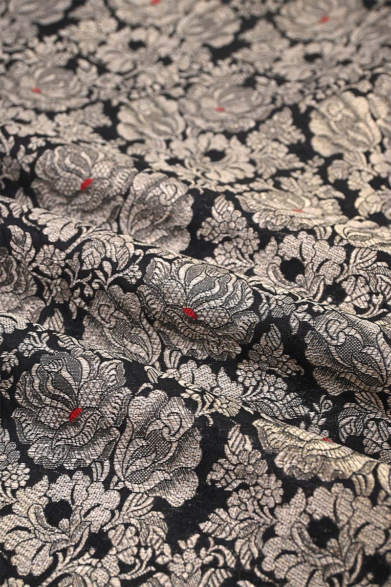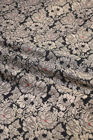 This Black Banarasi silk fabric features a golden zari woven rose floral brocade jaal design, beautifully adorned with Red resham meenakari detailing. The combination of floral motifs with meenakari highlights makes it an excellent choice for festive and wedding wear.