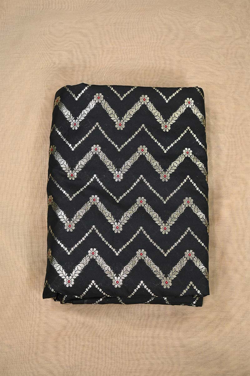 This black Banarasi silk fabric features beautifully woven zig-zag floral stripe patterns highlighted with zari. The design is further enhanced with fine meenakari work arranged geometrically across the fabric, adding richness and detail. The deep black base gives it a bold, elegant look, making it a perfect choice for festive and special occasions.