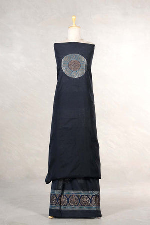 This black Chanderi silk suit set includes two unstitched pieces designed for festive wear and traditional gatherings. The kurta features an antique zari woven ethnic circular mandala motif placed prominently, offering a heritage-inspired touch. It is paired with a matching bottom fabric that carries an intricately designed antique zari woven border, perfect for enhancing the ankle line when stitched. This dress material is ideal for occasions that call for minimal yet defined detail.