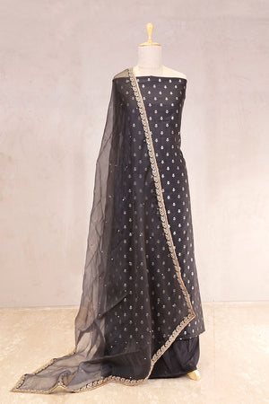 This Black Chiniya silk suit set is a premium choice for festive celebrations and cultural gatherings. The kurta is adorned with water gold zari woven floral buti all over, adding a subtle shimmer. Paired with an embellished organza silk dupatta and a matching running bottom pant, this dress material offers a well-coordinated look perfect for special occasions.