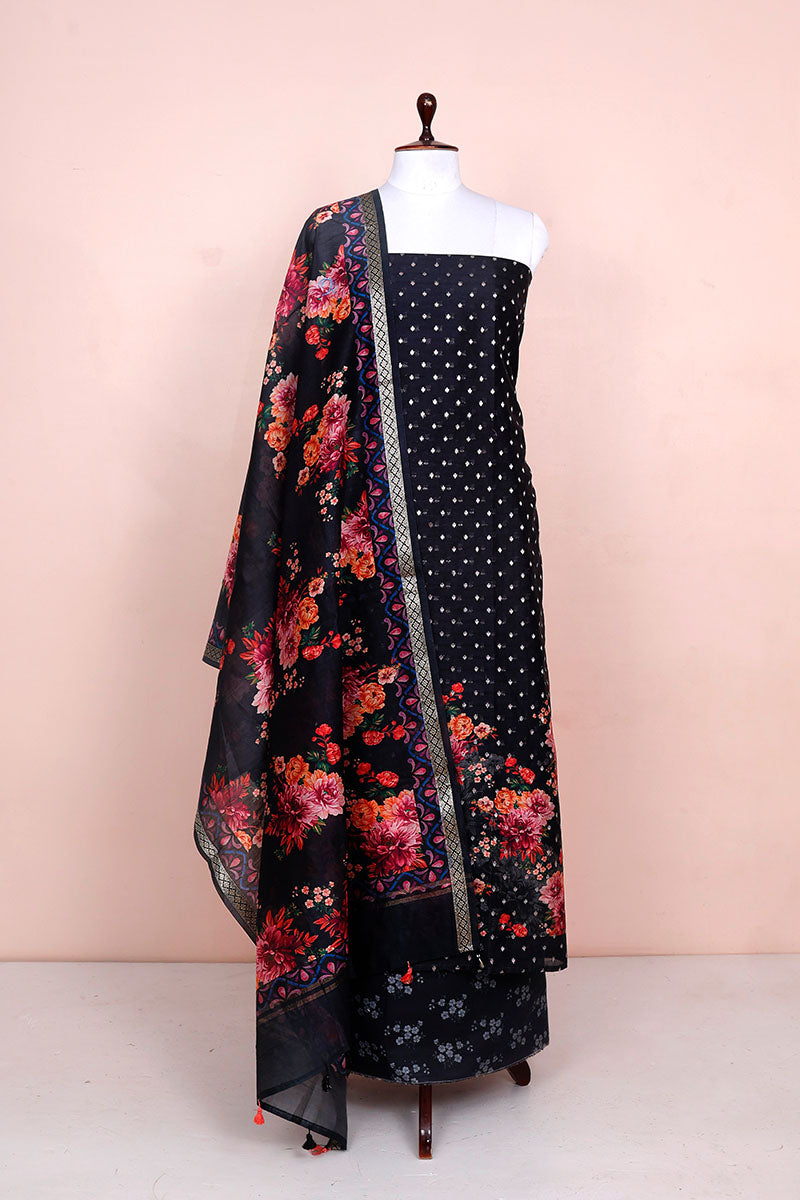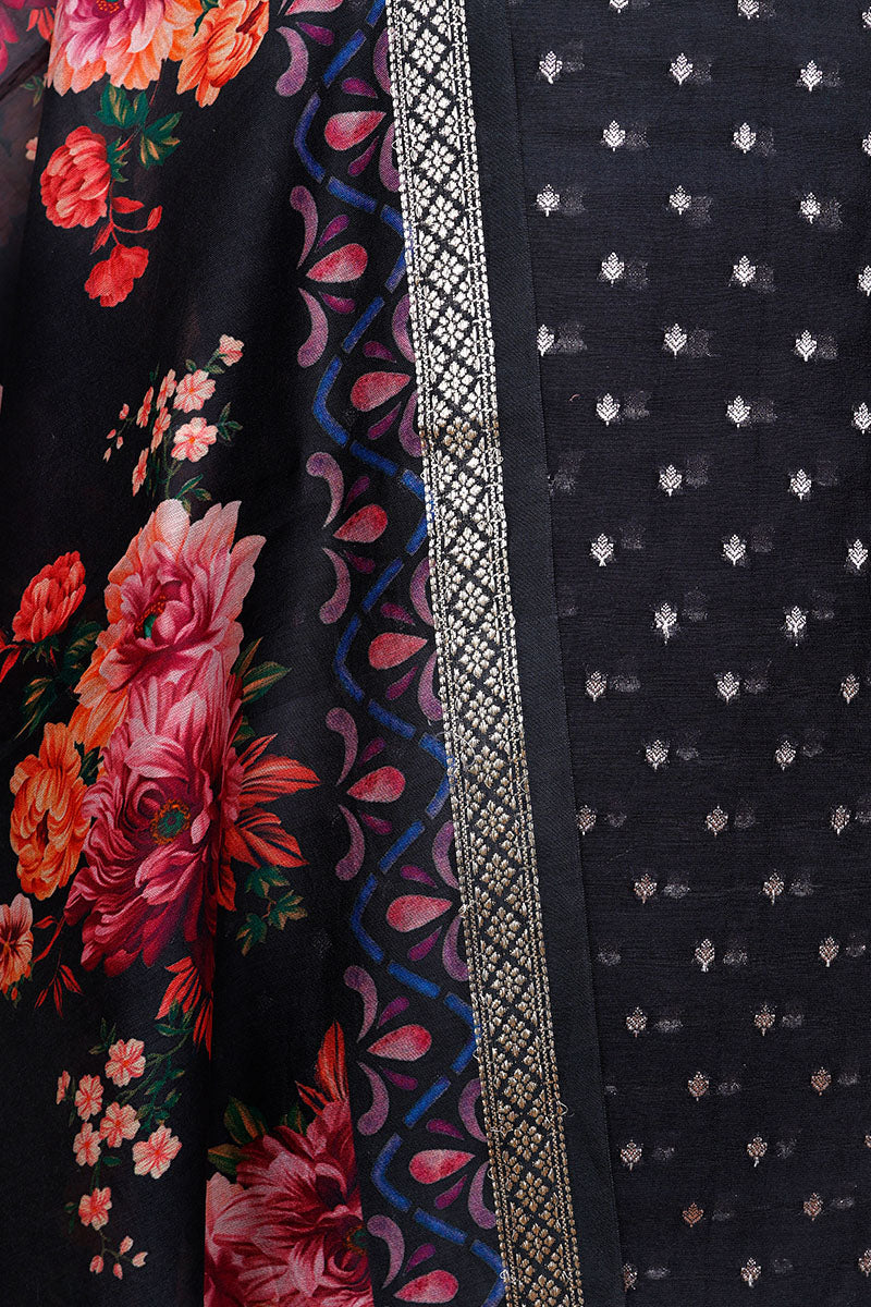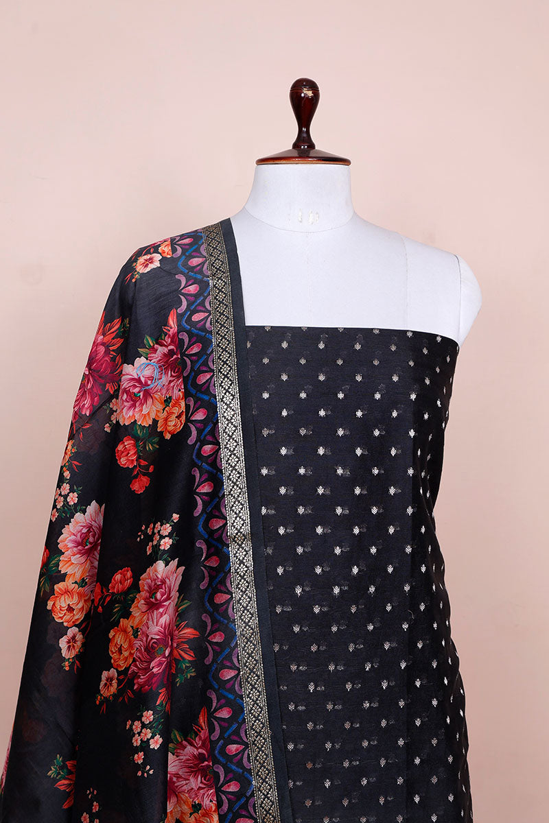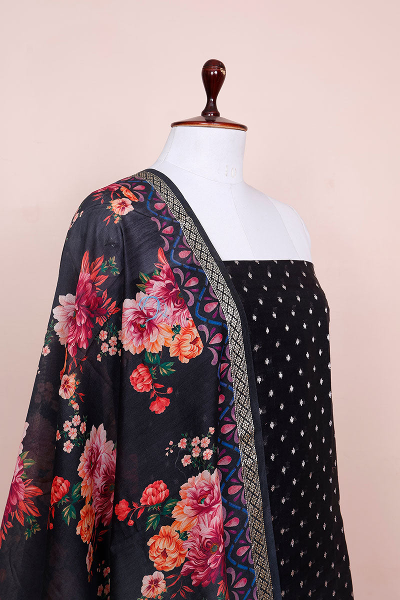 Experience a fashion-forward transformation with our exquisite kurta ensemble. Immerse yourself in the charm of silver zari woven small buti adorning the kurta fabric, complemented by a riot of colorful floral digital prints along the border. The set is beautifully paired with a matching chanderi dupatta featuring subtle floral prints. Achieve unparalleled style with this captivating outfit! An apt pick to be worn for traditional or casual occasions, this chanderi silk dress material adds a touch of sophistication and sophistication to your look, ensuring you stand out with grace and charm.
