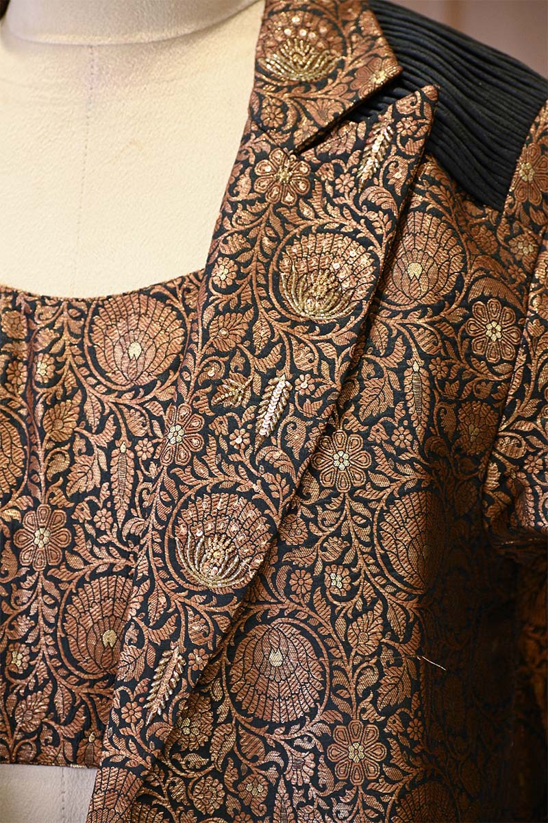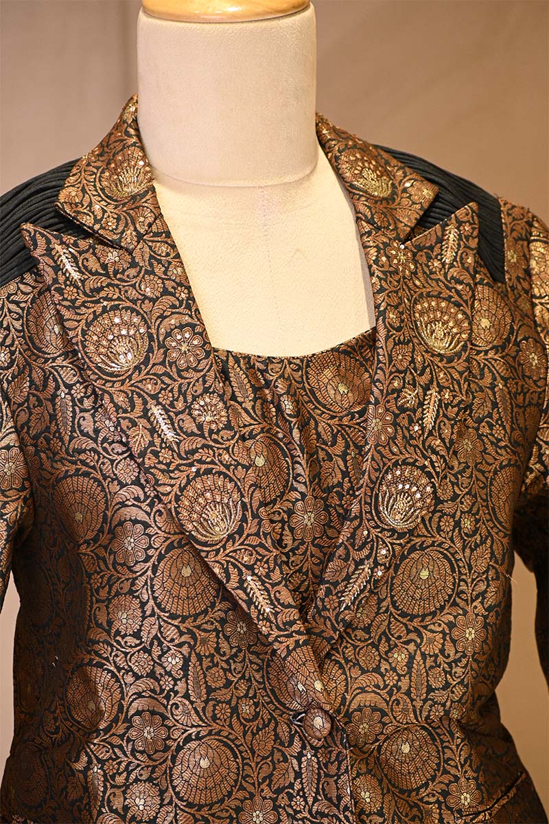 Elevate your wardrobe with our stunning Black Embellished Floral Jaal Woven Banarasi Silk Co-Ord Set. This beautiful set has antique zari woven floral motifs all over the blazer with embellishments on the collar and comes with a crop top and matching pants. Finish your look by adding a chic necklace and earrings with matching heels and handbag. Be the trendsetter by wearing this fabulous co-ord set where traditional fabric gets the modern twist and gets the fashionista look.