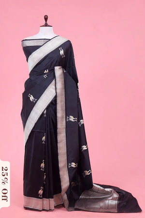 This black kadhwa woven katan silk handloom Banarasi saree is woven with intricate silver zari and meenakari woven Shuturmurg (ostrich) motifs that embellish the entire fabric, creating a unique and artistic flair. The saree features a beautifully woven silver zari border and pallu, enhancing its overall elegance. It comes with a matching running blouse piece, perfect for customizing your look.