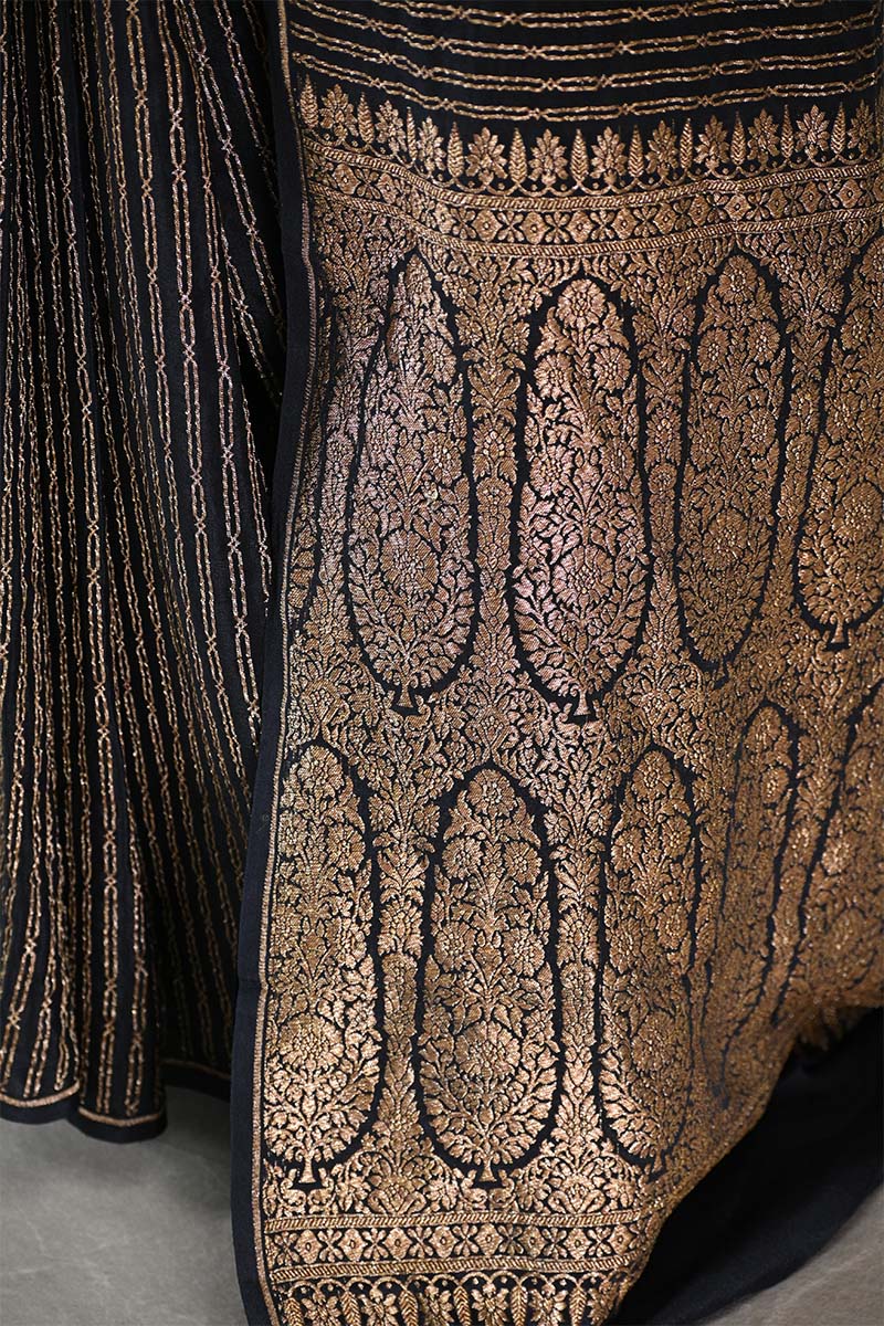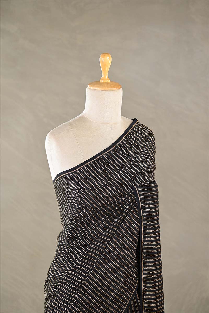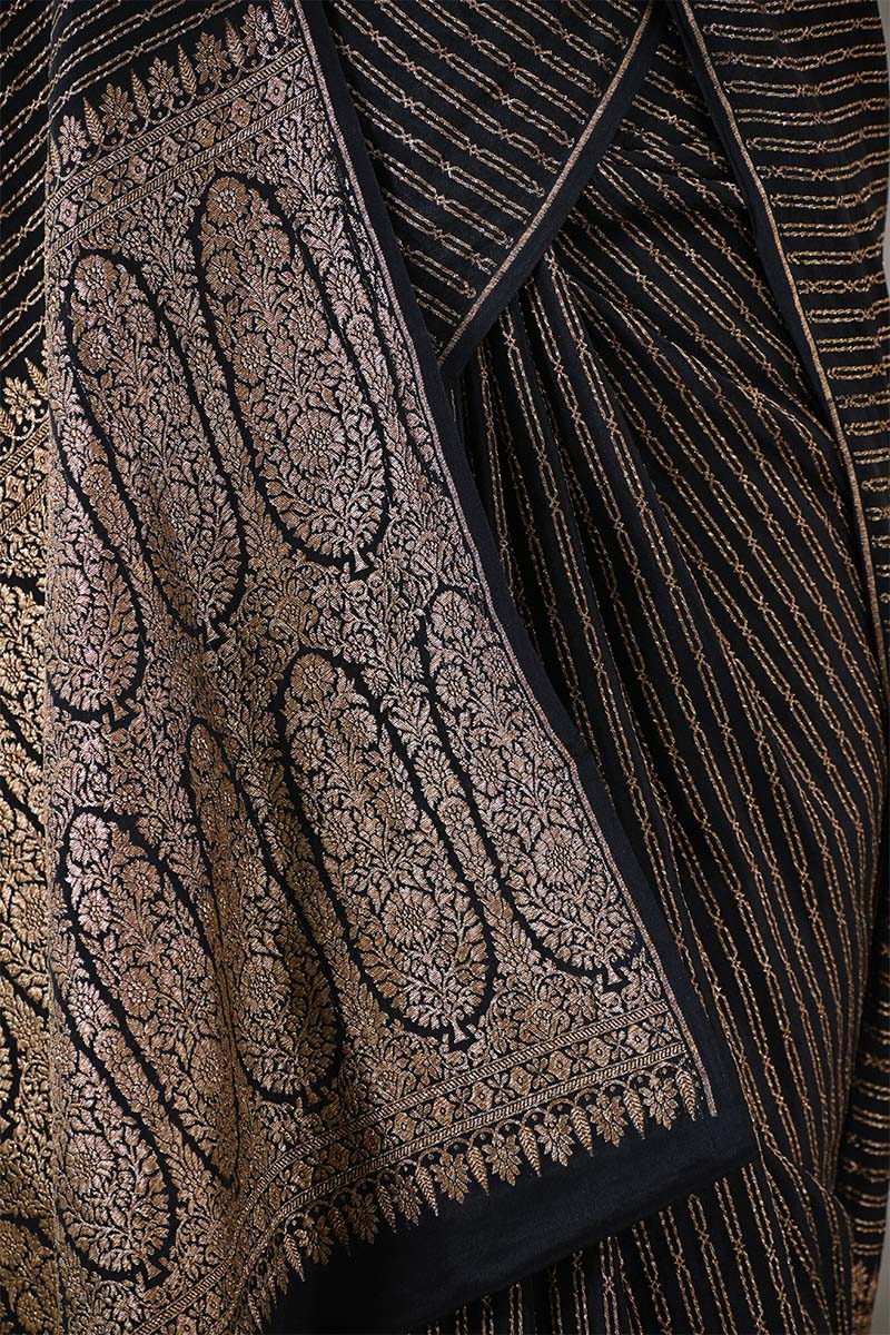 This Black handloom crepe silk saree is adorned with elegant antique zari woven stripes running across the saree, the crepe khaddi base material creating it a refined and traditional look. The saree is complemented by an intricate pallu, adding sophistication to its design. It comes with a matching running blouse piece for custom styling.
