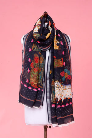 This linen dupatta is made from soft, comfortable fabric. The elegant black color features intricate digital printed Kalamkari motifs throughout, with the border adorned by a 1 cm silver zari woven trim for added refinement.