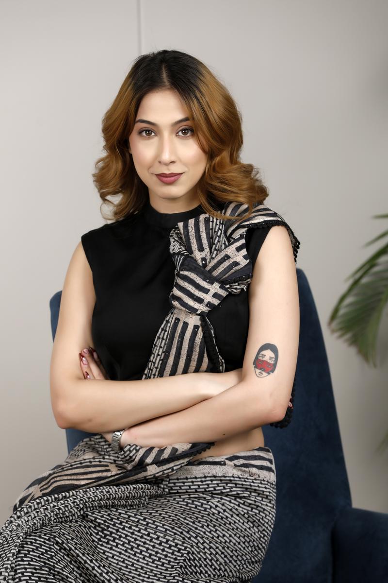 This black mulmul cotton saree is designed for office wear with a creative twist. The saree features geometrical digital printed horizontal stripes across the body, enhanced with subtle mirror work embellishments. Finished with lace borders along the edges, it offers a smart yet stylish appeal. It is paired with a black printed unstitched blouse piece that is also complemented with matching lace detailing.