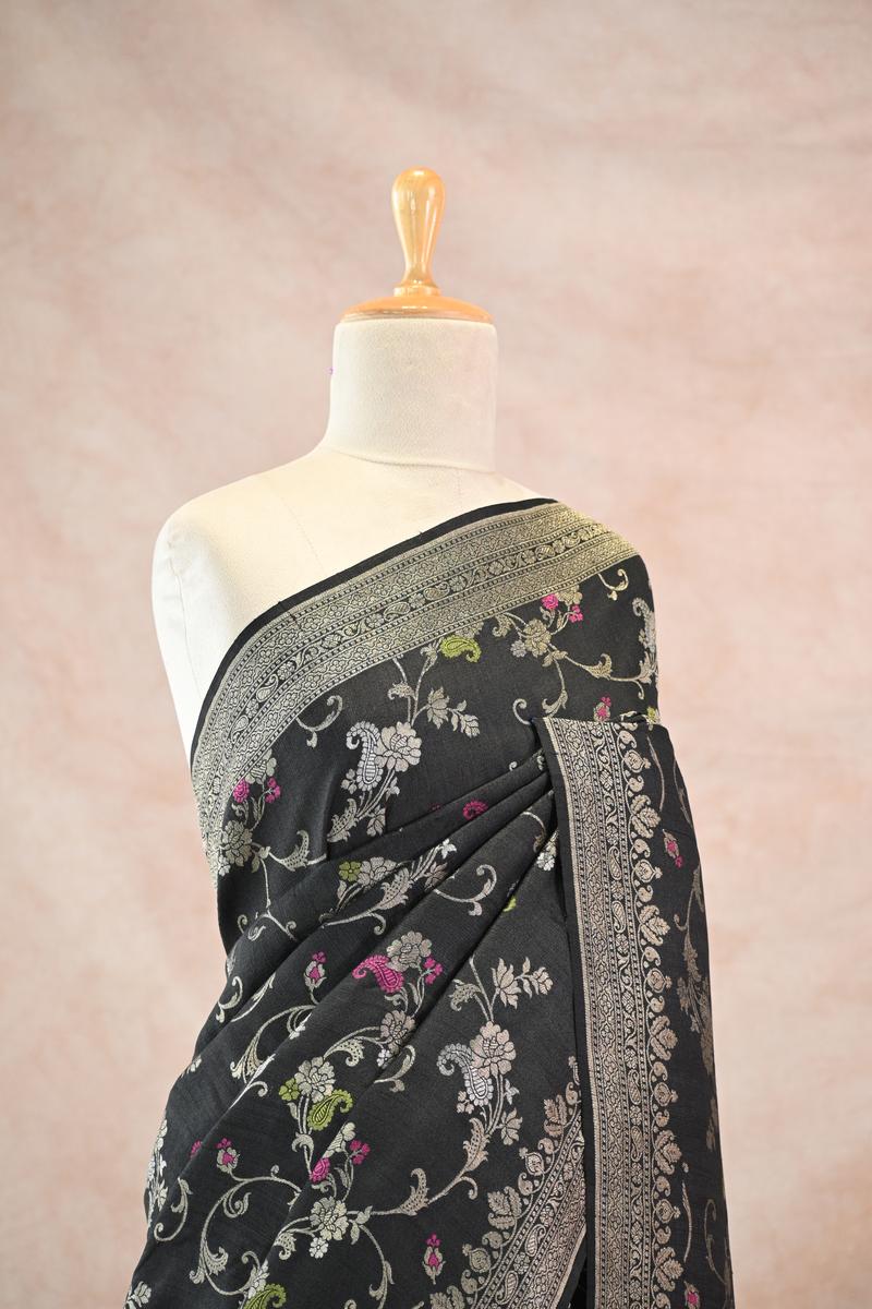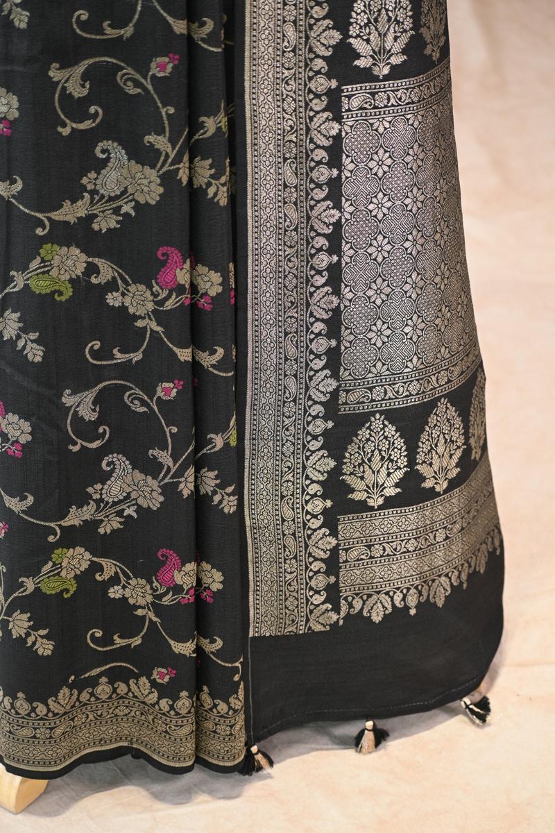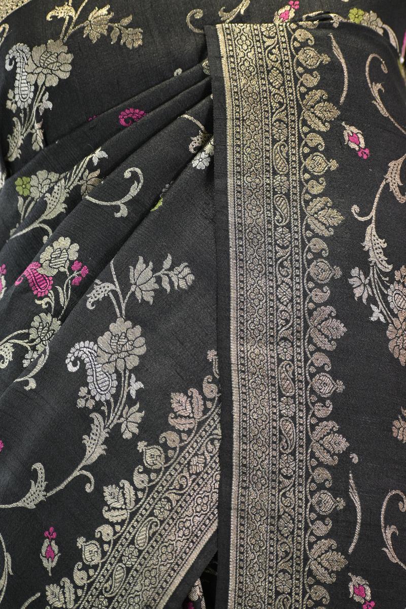 This black Tussar Khaddi silk saree is intricately adorned with water-gold zari and meenakari–woven floral and paisley motifs arranged in a graceful jaal across the body. The border features elegant gold zari–woven floral detailing that adds a refined touch. The pallu is highlighted with ethnic motifs complemented by a geometric zari pattern, lending the saree a rich and traditional appeal. It comes with a matching unstitched blouse piece.