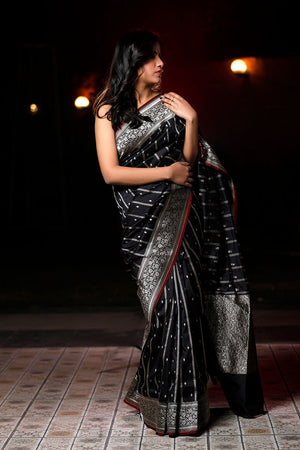 Featuring silver zari woven stripes, this black semi-silk saree exudes timeless elegance. The delicate silver zari woven buti and ethnic motif border and pallu add a touch of sophistication and charm. Crafted for comfort and style, this saree drapes effortlessly, enhancing your allure. Complete with a matching unstitched blouse piece, this one will add oodles of style to your ensemble.