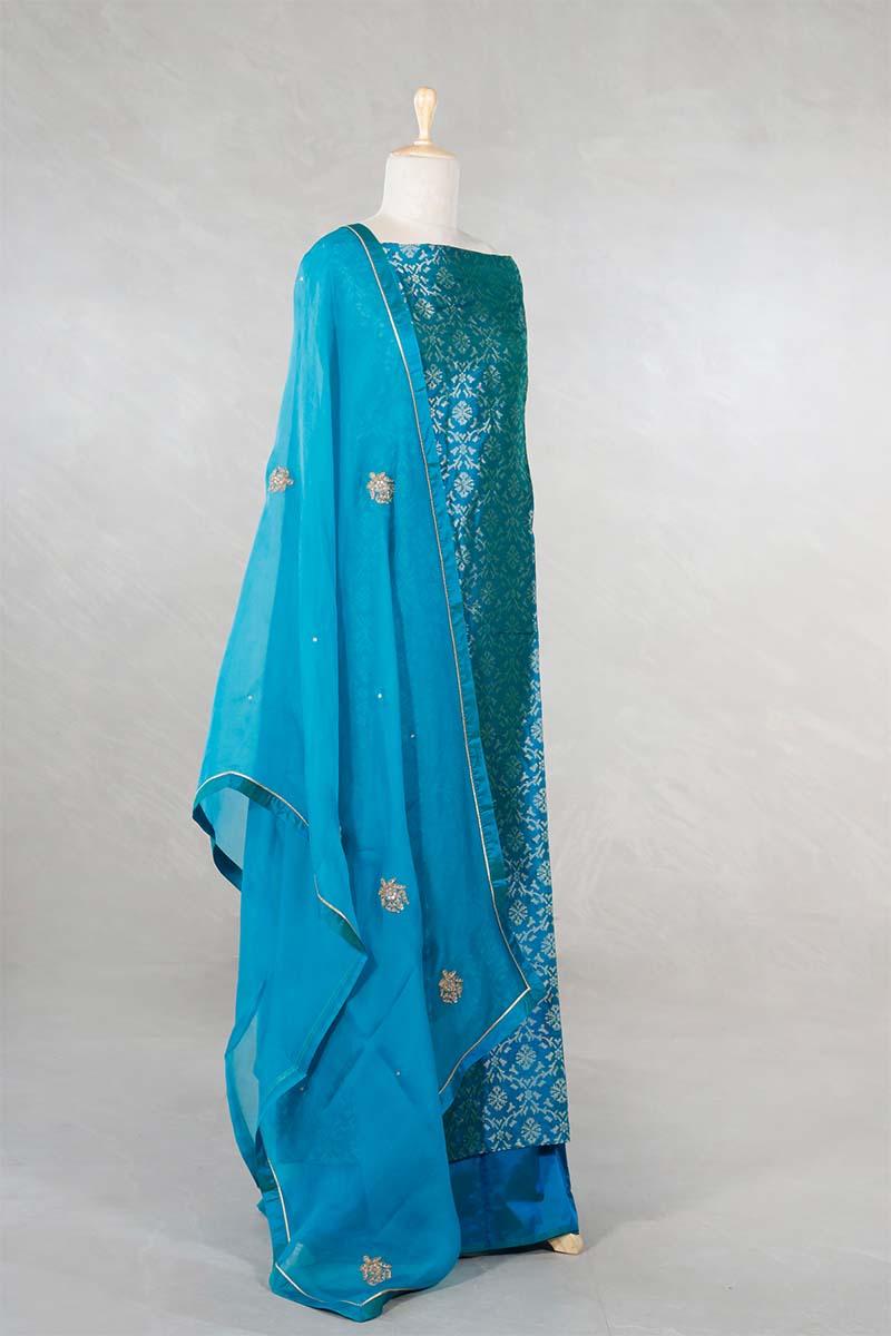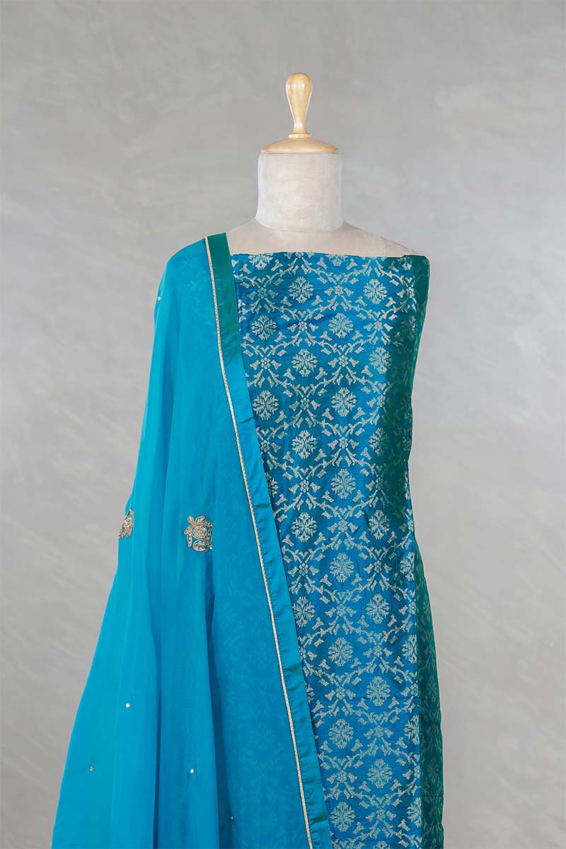 This Blue Katan silk suit set is crafted for festive occasions and traditional events. The kurta features an ikkat motif-inspired gold zari woven jaal in a brocade pattern spread across the fabric. It is paired with matching silk bottom pants and an embellished organza silk dupatta, which is finished with a lace border. This coordinated dress material offers a balanced and complete ethnic ensemble.