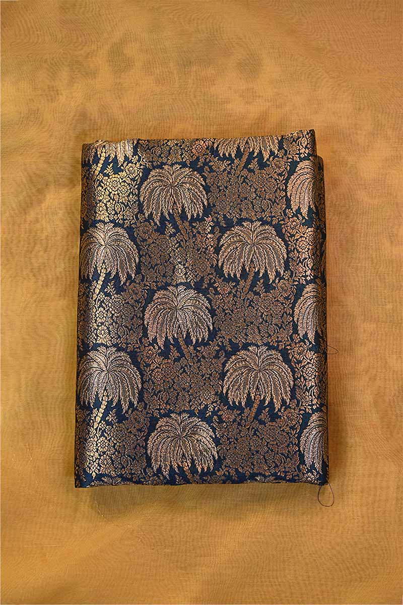 This Blue Banarasi silk fabric features an intricately designed floral jaal pattern woven with gold zari. The fabric is further enhanced with distinctive palm tree motifs in gold and silver zari, thoughtfully placed within the jaal design to add character and charm.