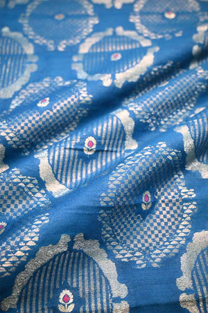 This blue Banarasi silk fabric features intricately woven ethnic circular motif butas in silver zari, adorned with small floral motifs highlighted with meenakari detailing. The fine texture and balanced design make it a suitable choice for creating traditional or festive wear.
