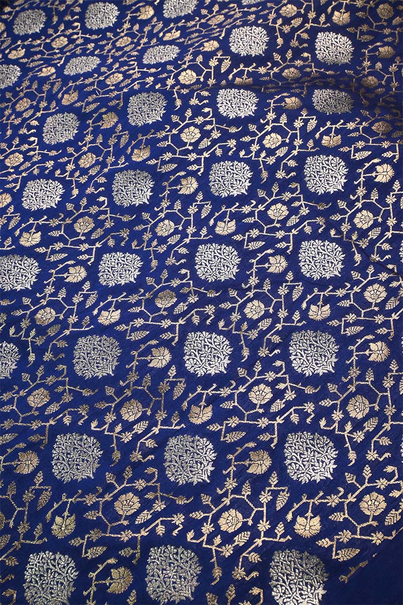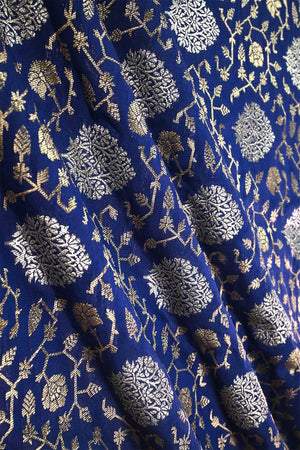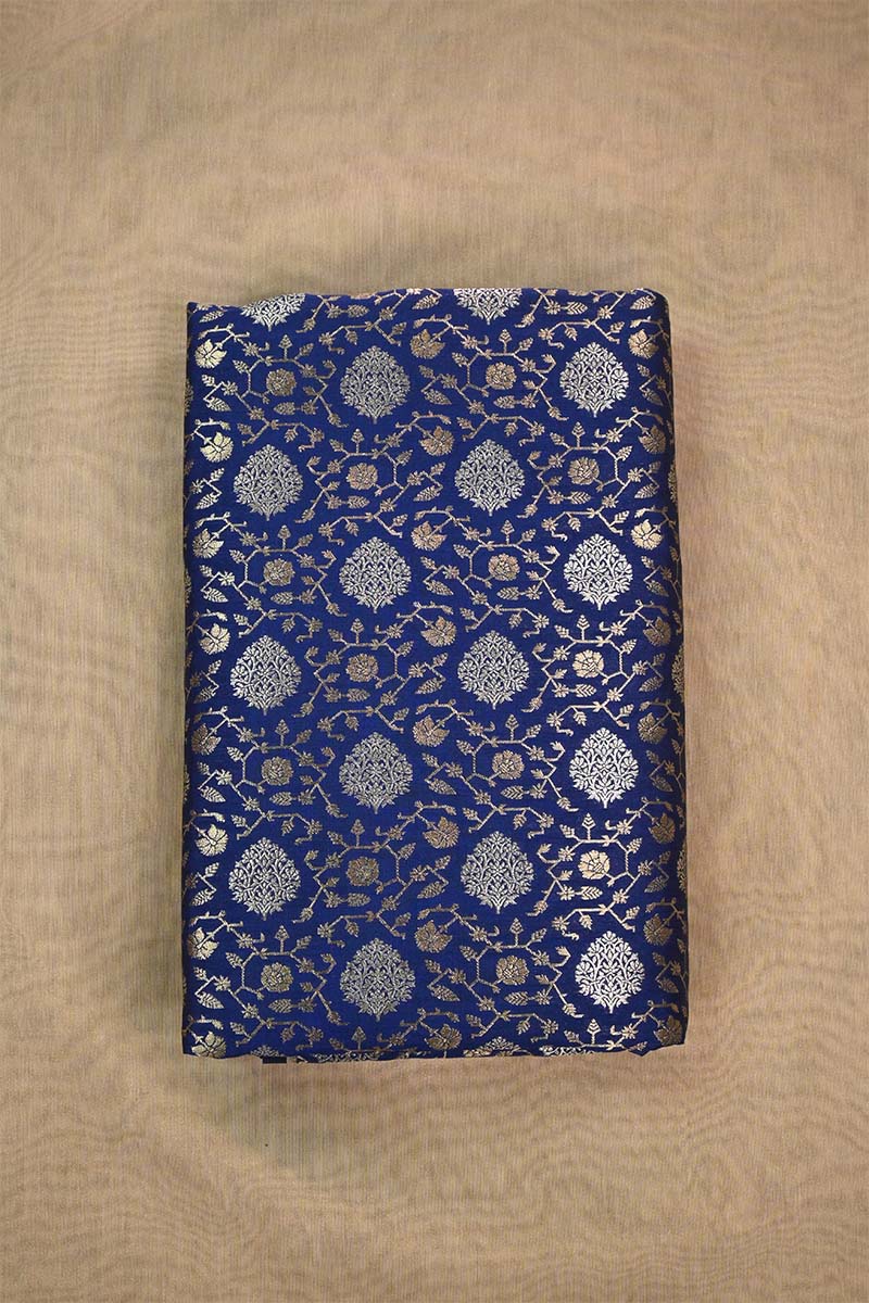 This blue Banarasi silk fabric features a finely woven gold zari geometrical floral jaal design, further highlighted with silver zari floral buta motifs spread across the fabric. The dual-tone zari detailing adds depth and texture, making it a versatile choice for traditional and festive wear.
