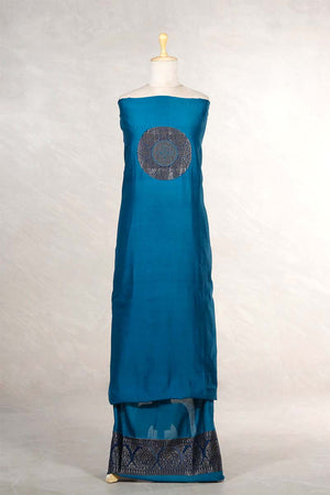 This blue Chanderi silk suit set includes two unstitched pieces designed for festive wear and traditional gatherings. The kurta features an antique zari woven ethnic circular mandala motif placed prominently, offering a heritage-inspired touch. It is paired with a matching bottom fabric that carries an intricately designed antique zari woven border, perfect for enhancing the ankle line when stitched. This dress material is ideal for occasions that call for minimal yet defined detail.