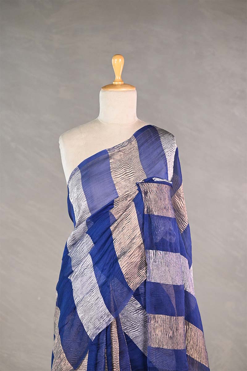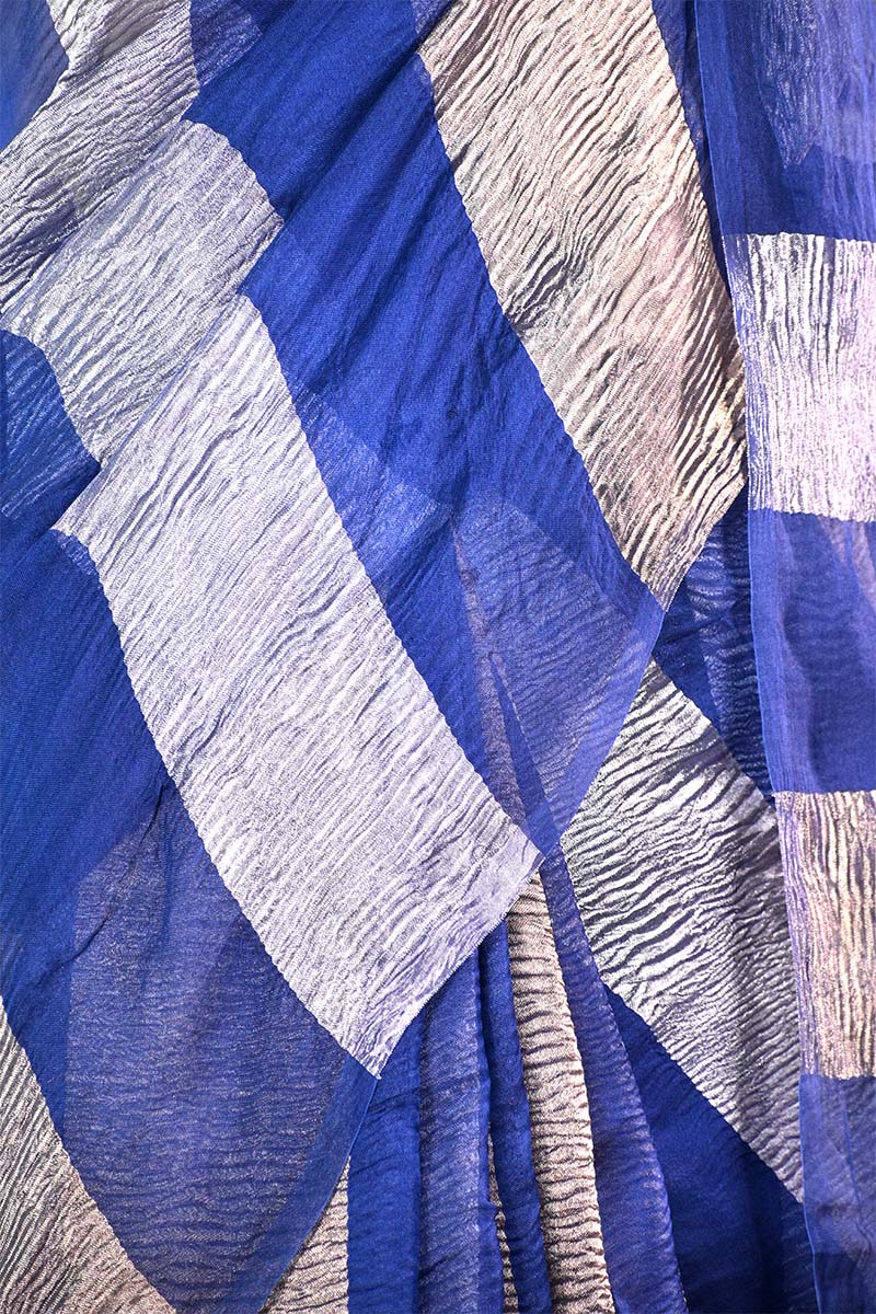 This blue pure organza silk saree is designed with crushed tissue gold and silver zari woven stripes for a contemporary appeal. It is paired with a matching unstitched blouse piece embellished with pitta zari work for custom stitching.