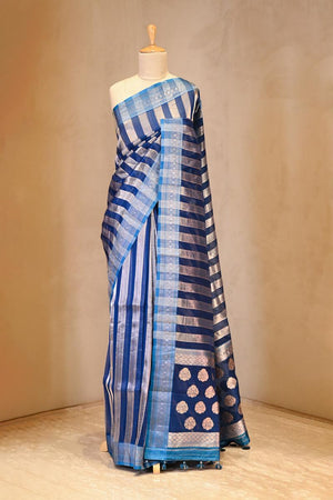 This blue organza tissue silk saree features elegant silver zari woven vertical stripes across the body. The border is designed with intricate geometric silver zari work, while the pallu is adorned with finely zari-woven floral butas. It is paired with a chiniya silk blouse piece detailed with organza silk stripes and a zari border for custom stitching.