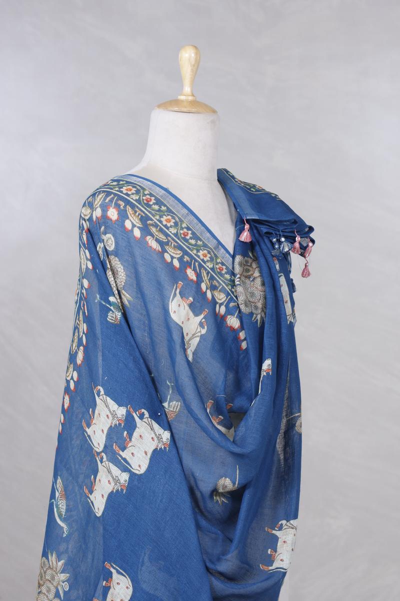 This pure linen dupatta in a calming blue shade features Pichwai-inspired cow motifs printed all over the body. The borders are beautifully designed with floral Pichwai artwork and finished with a 1 cm silver zari woven stripe for a subtle decorative touch.