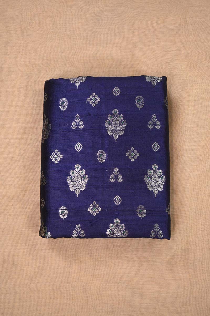 This Blue raw silk fabric features antique zari-woven floral and ethnic motifs, further enhanced with green meenakari details. The textured raw silk base paired with intricate zari and meenakari work makes it a standout option for traditional attire.