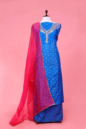 This blue Tussar silk bandhani printed suit set is a perfect choice for festive and traditional occasions. The kurta is adorned with intricate embroidery and a delicate bird motif on the neckline, adding a touch of artistry. Paired with a pink embellished organza silk dupatta and a running bottom, this set brings together elegance and vibrant style.