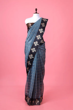 Amp up your ethnic charm with this bluish-grey woven Banarasi cotton saree. Adorned with exquisite water gold and antique zari woven checks all over, it features delicate floral buta on the border and pallu in antique and water gold zari. Complete with a contrast brocade unstitched blouse piece, this saree effortlessly combines tradition and elegance in a mesmerising ensemble. Accessorise this saree with the right jewellery to look your best.