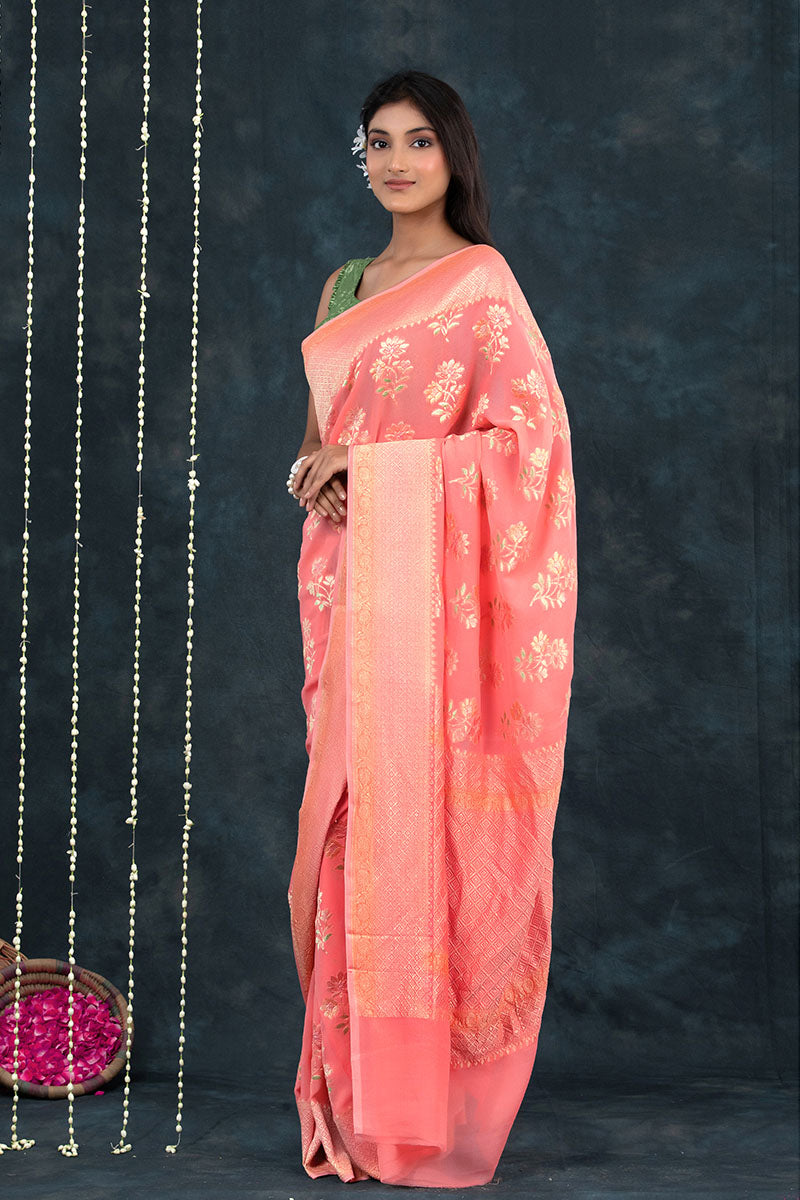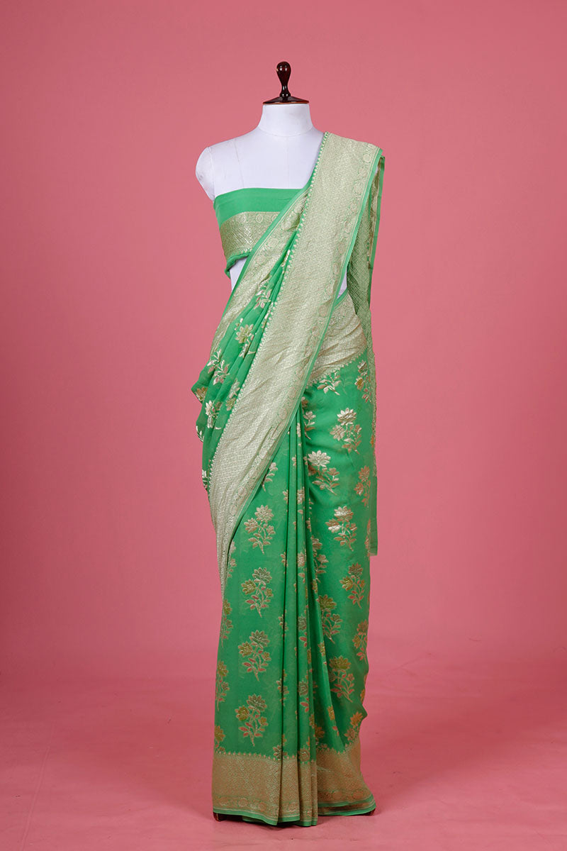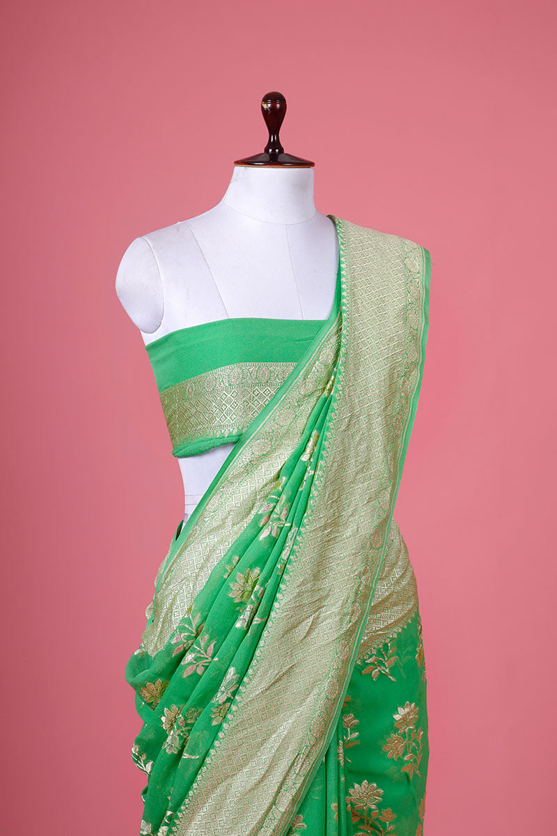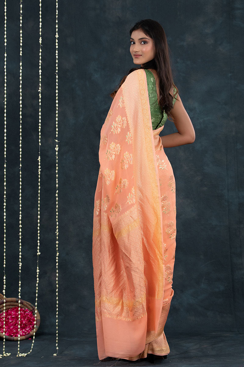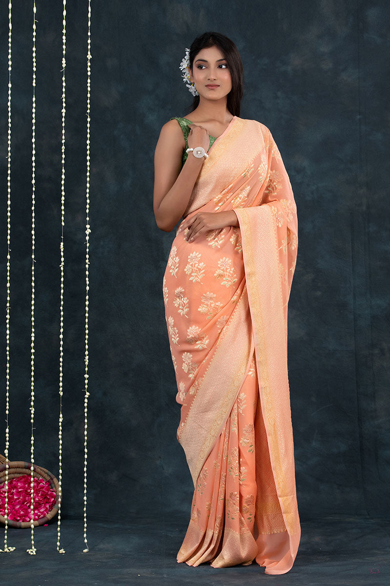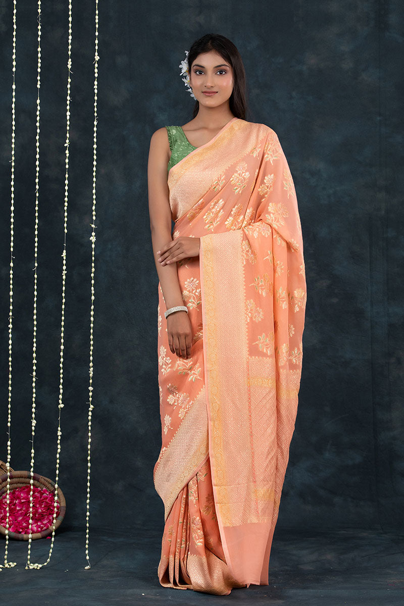The georgette khaddi saree spreads charm from every inch, making it a must-have for everyone. The saree has woven gold zari handpainted Floral buta features with woven gold & silver zari border . The saree comes with a blouse piece. Pair this saree with statement jewellery for a luxurious look.