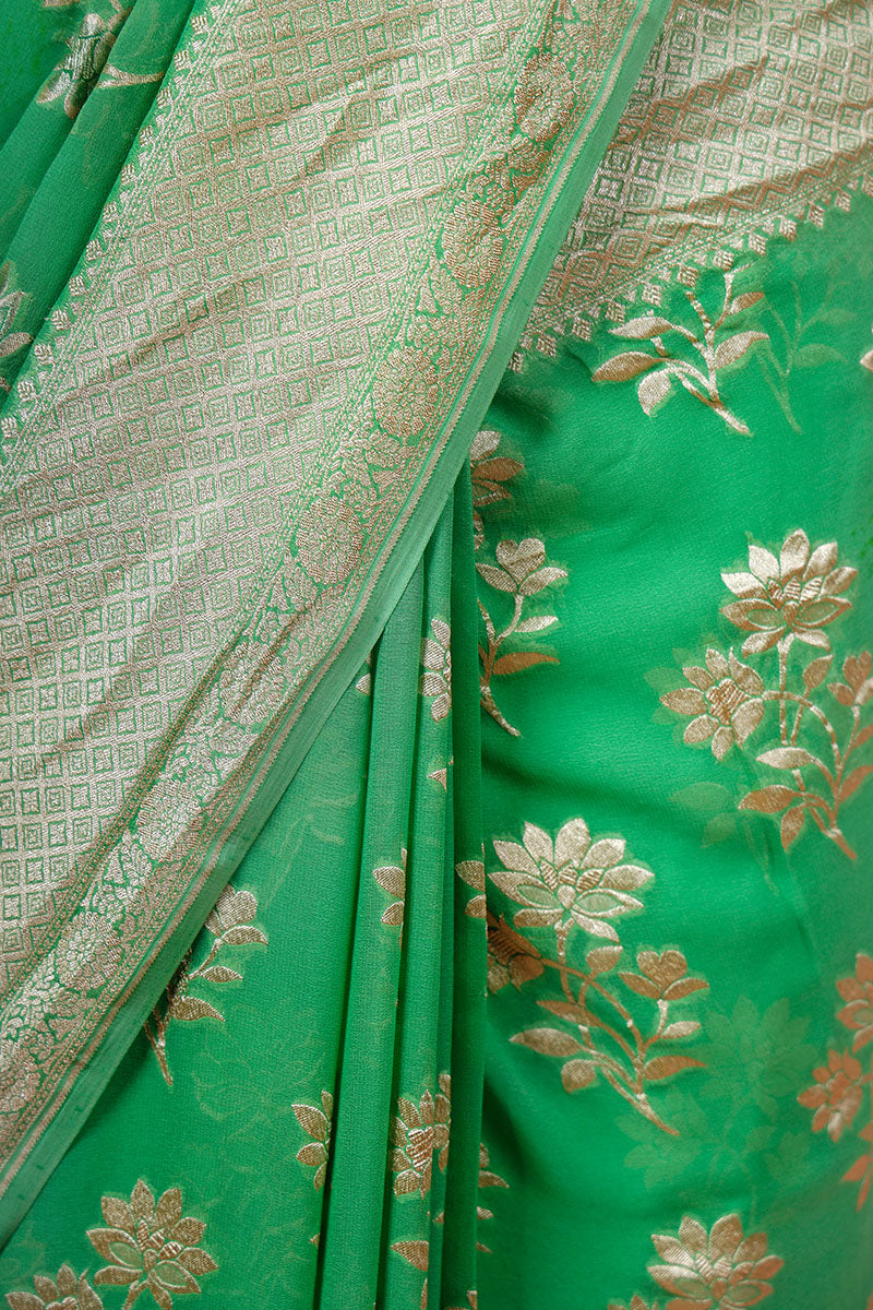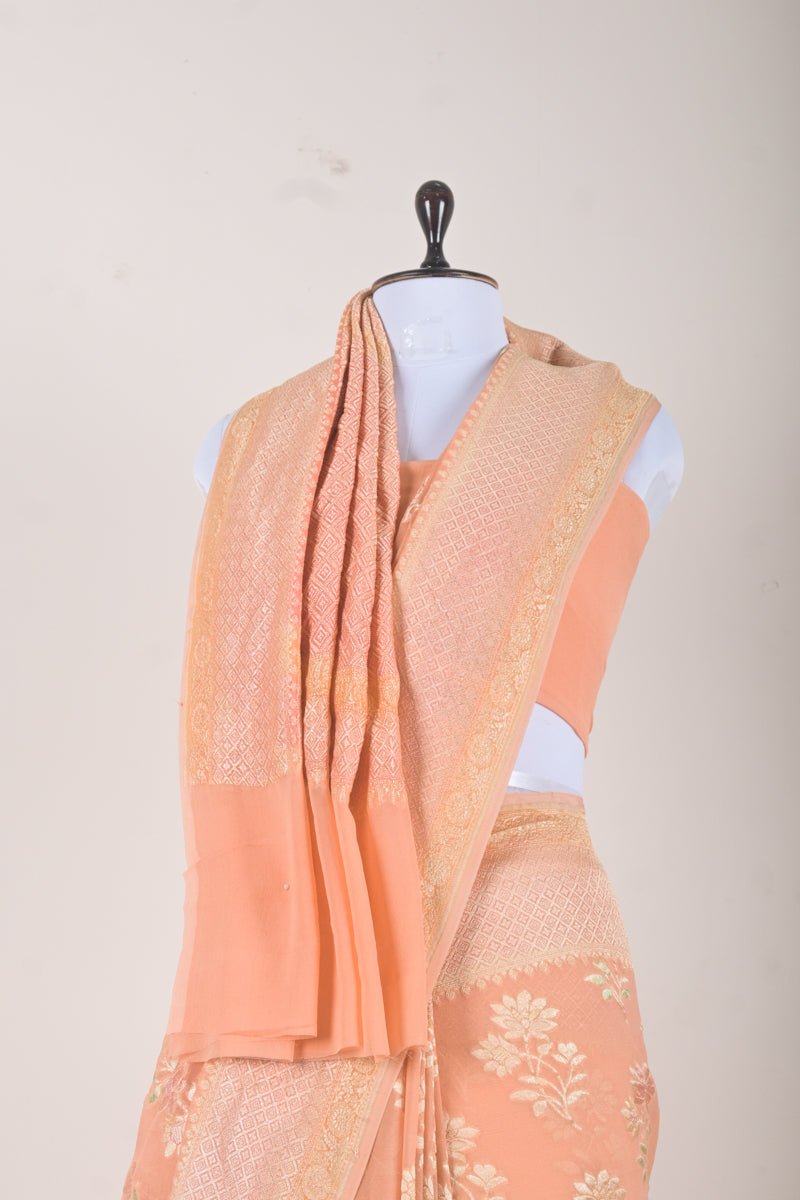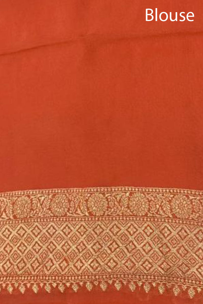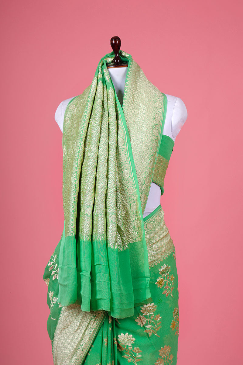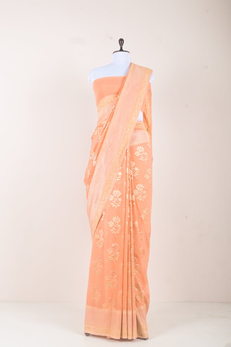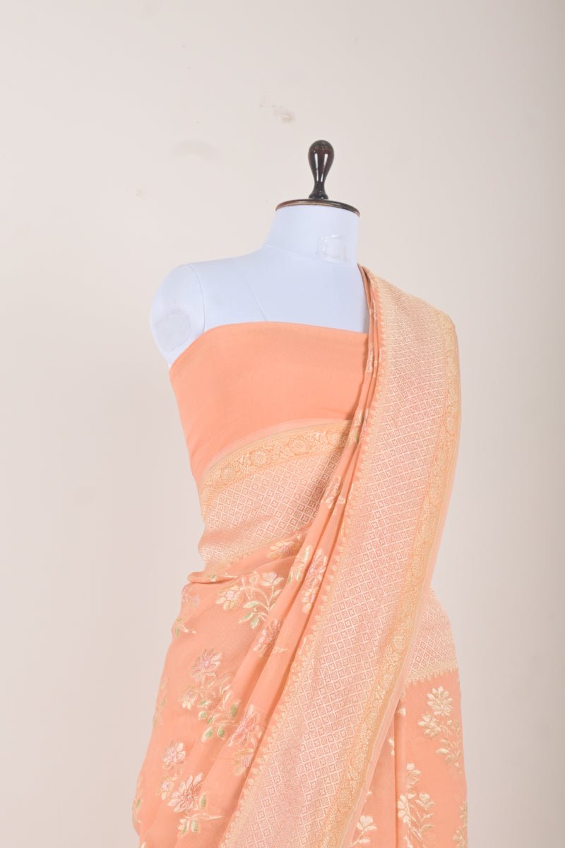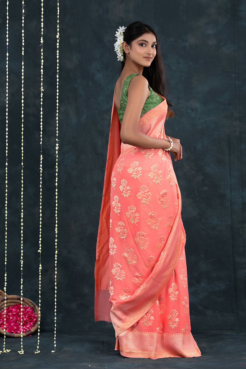 The georgette khaddi saree spreads charm from every inch, making it a must-have for everyone. The saree has woven gold zari handpainted Floral buta features with woven gold & silver zari border . The saree comes with a blouse piece. Pair this saree with statement jewellery for a luxurious look.
