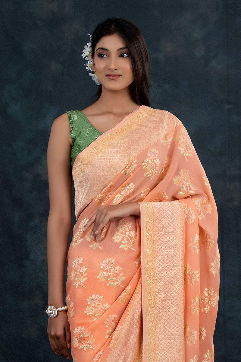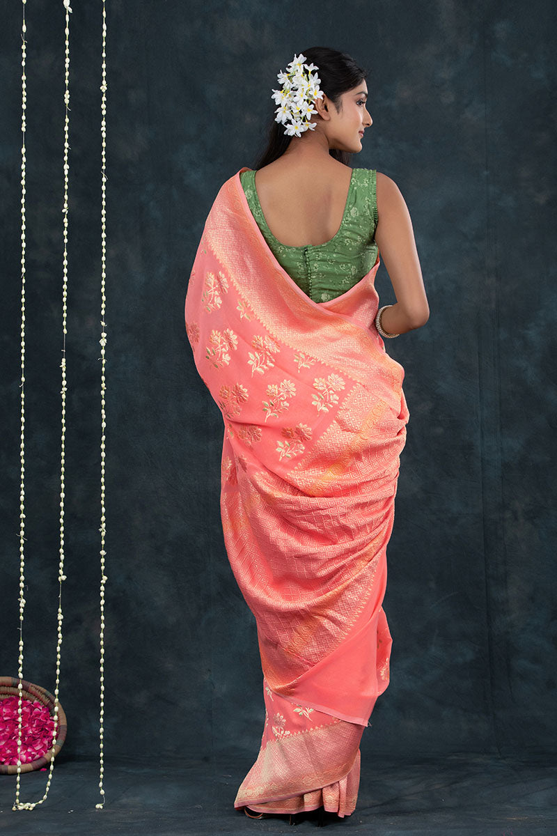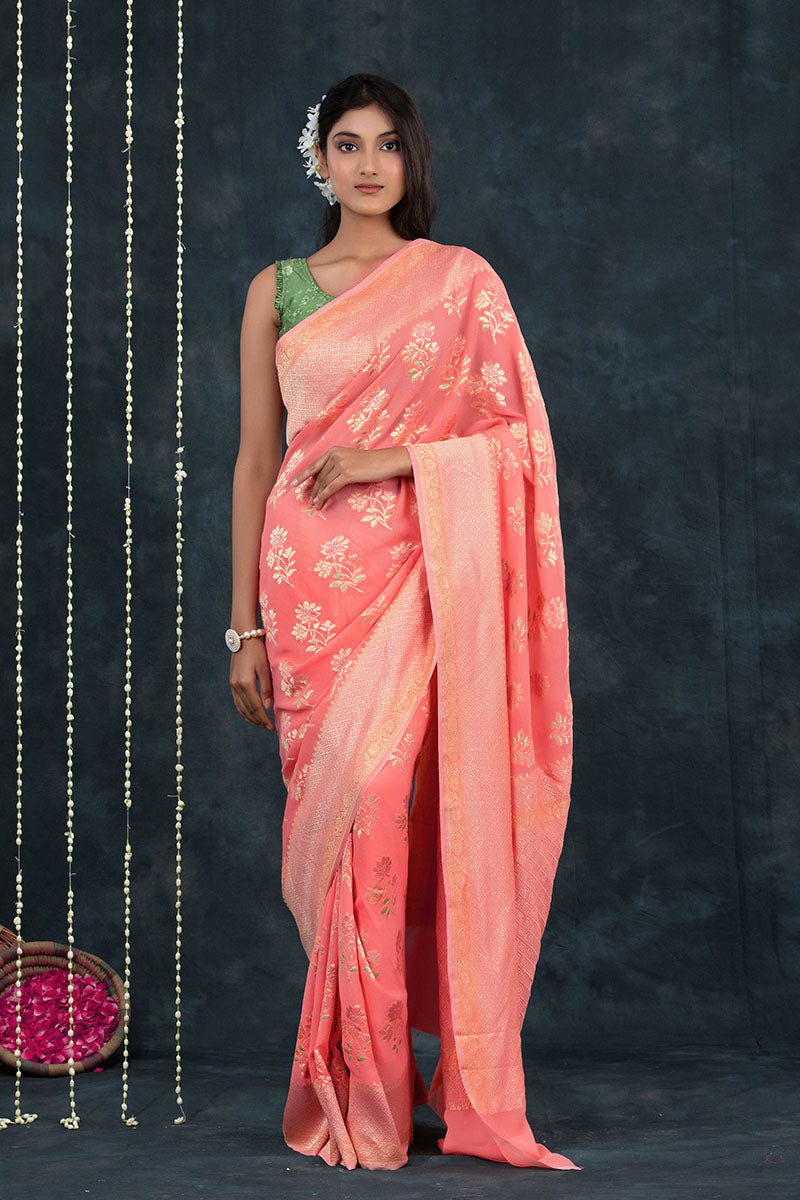 Features – The enchanting georgette khaddi saree features woven handpainted floral buta.
