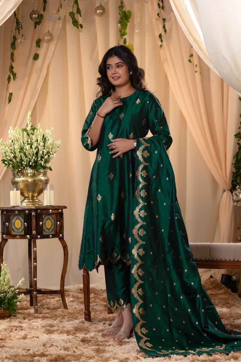 This bottle green Banarasi Katan silk suit set is designed with fine detailing, making it an ideal choice for special occasions. The knee-length flared A-line kurta features a round neckline and 3/4th sleeves, highlighted with a floral scalloped cutwork hemline. The fabric is decorated with gold zari ethnic motifs, enhancing the traditional appeal.