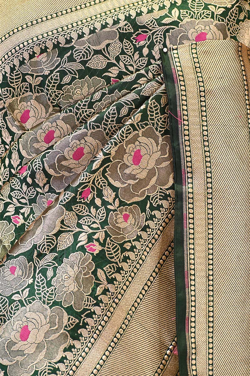 This Bottle green pure Banarasi katan silk saree is adorned with an intricate gold zari woven rose motif jaal, highlighted with pink meenakari detailing across the body. The border and pallu are woven with a geometric brocade pattern in gold zari. It is paired with a matching blouse piece finished with a gold zari woven border.