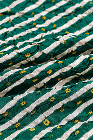 • This fabric is accentuated with timeless bandhej, Silver zari woven laheriya stripes adding grace and a touch of contemporary allure.