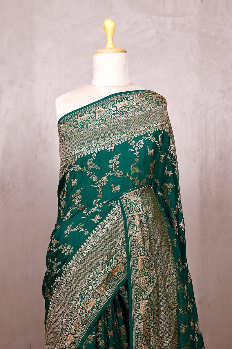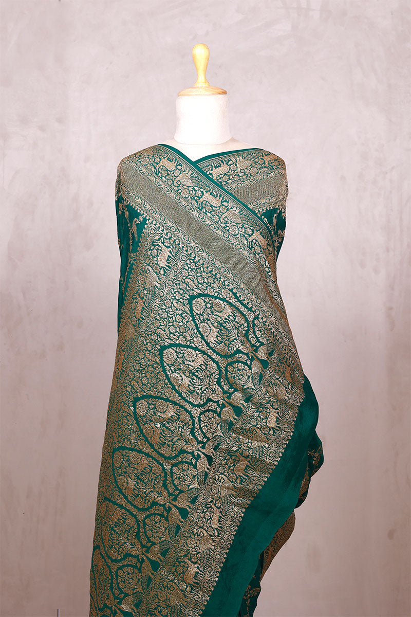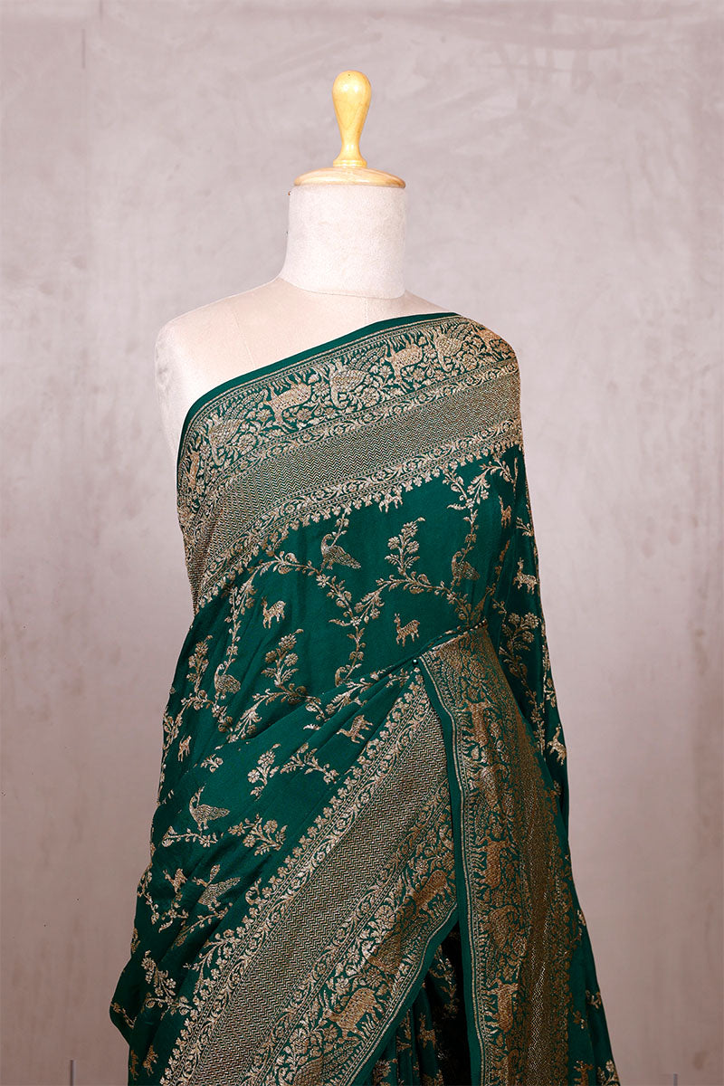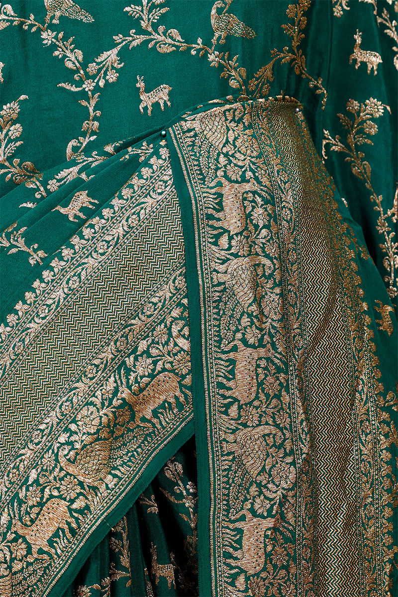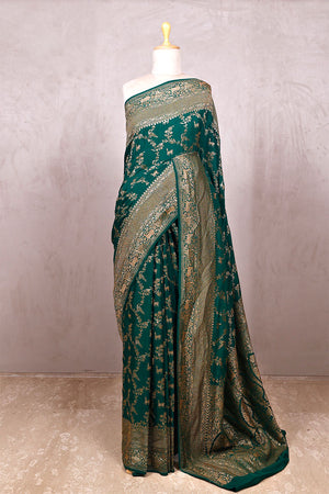 This bottle green crepe Banarasi khaddi silk saree is handloom woven with an intricate gold zari Shikargah floral jaal spread across the body, showcasing detailed craftsmanship. The border and pallu are adorned with complementing gold zari woven Shikargah floral patterns, enhancing its traditional appeal. It comes with a matching unstitched blouse piece, perfect for custom tailoring.