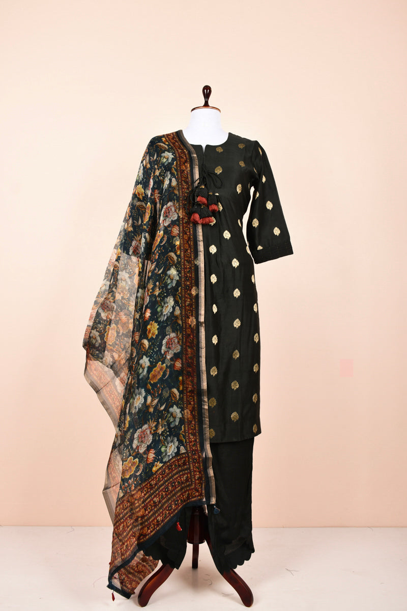 Lend a special look to your ensemble by wearing an outfit stitched from this amazing suit set. Flaunting woven gold zari buta all over the kurta and a v-shaped neck pattern with tassels, this suit set consists of matching pants and an organza silk floral print dupatta. This green-colored suit set is made of quality chanderi silk fabric and is light in weight which makes it a pleasure to wear.