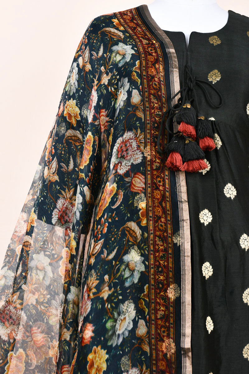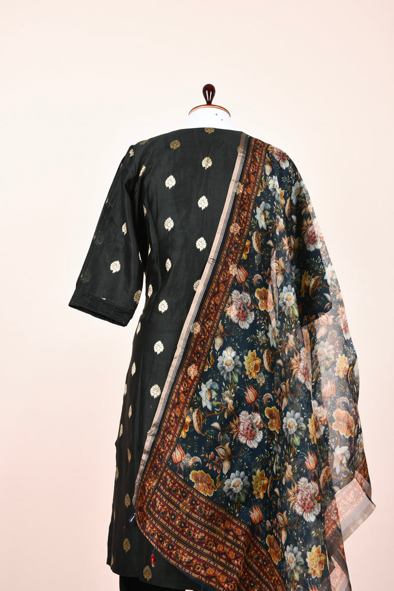 Features: It has woven gold zari buta all over kurta it has v-shaped neck adorned with tassels with matching pants paired with organza silk floral printed dupatta.