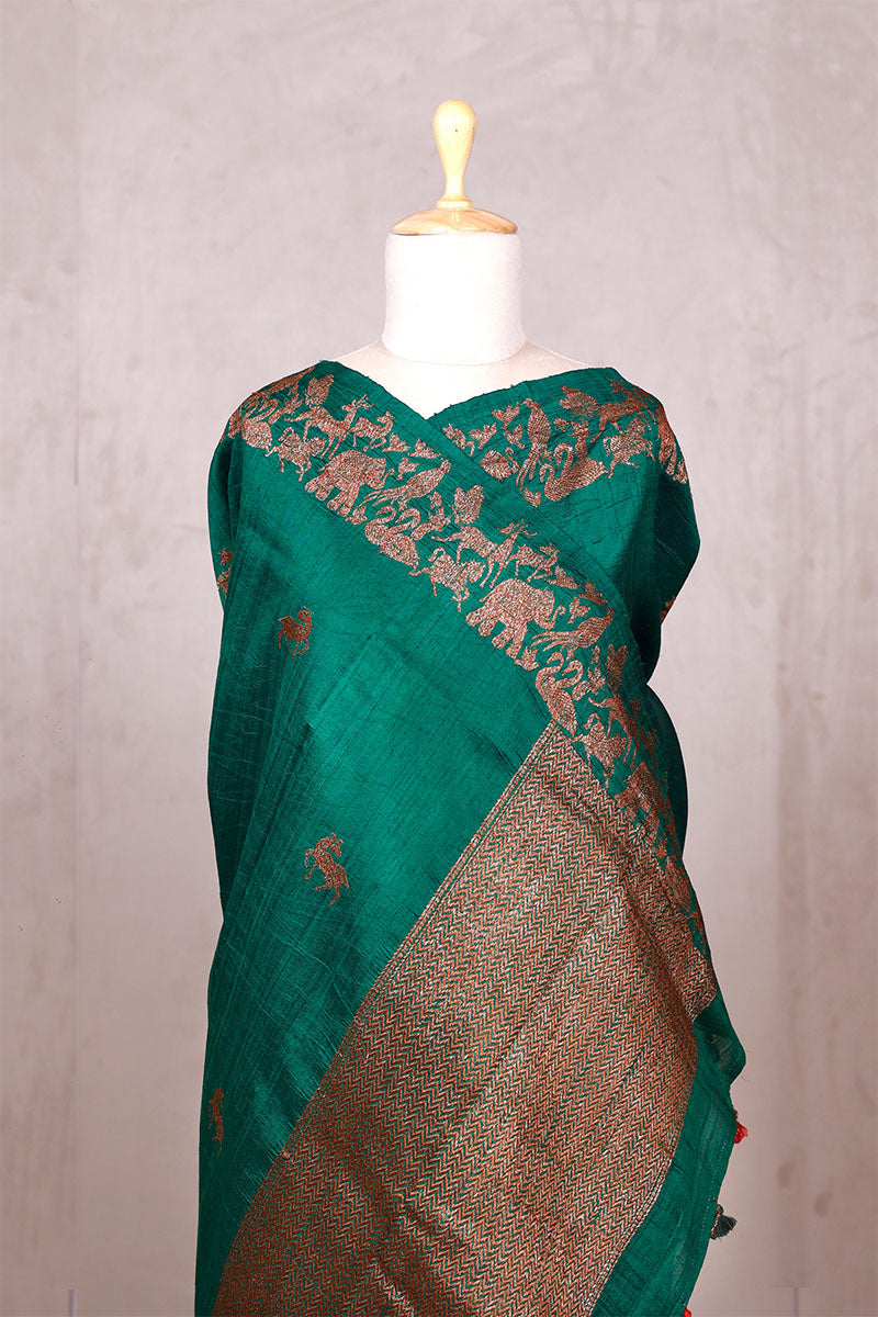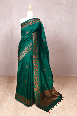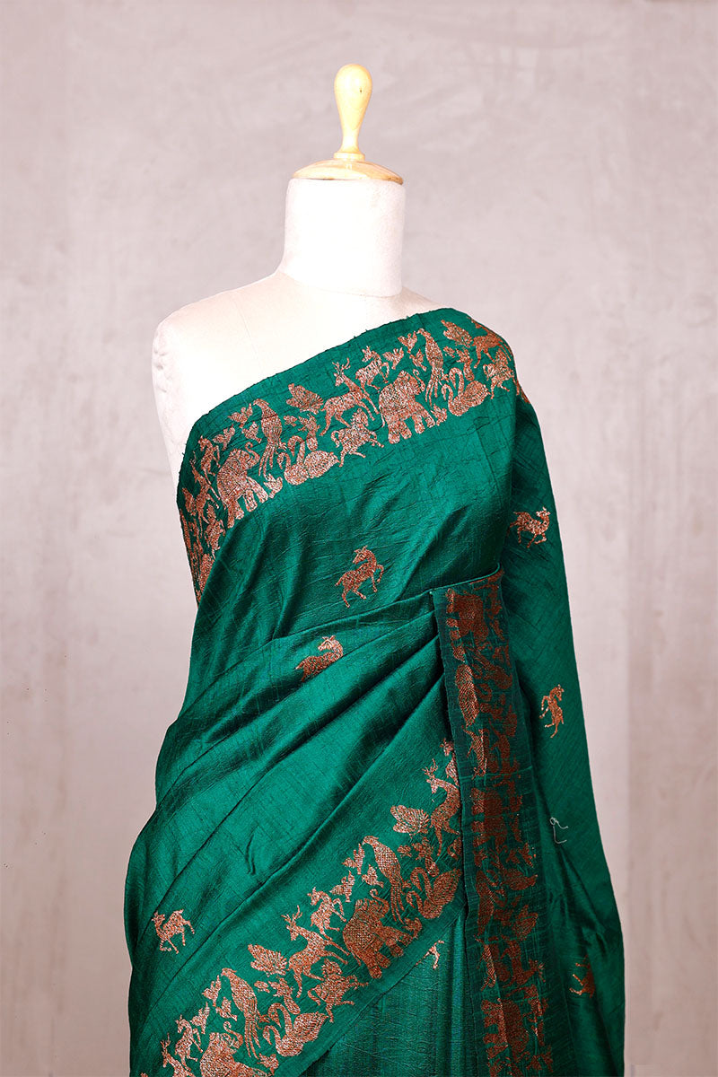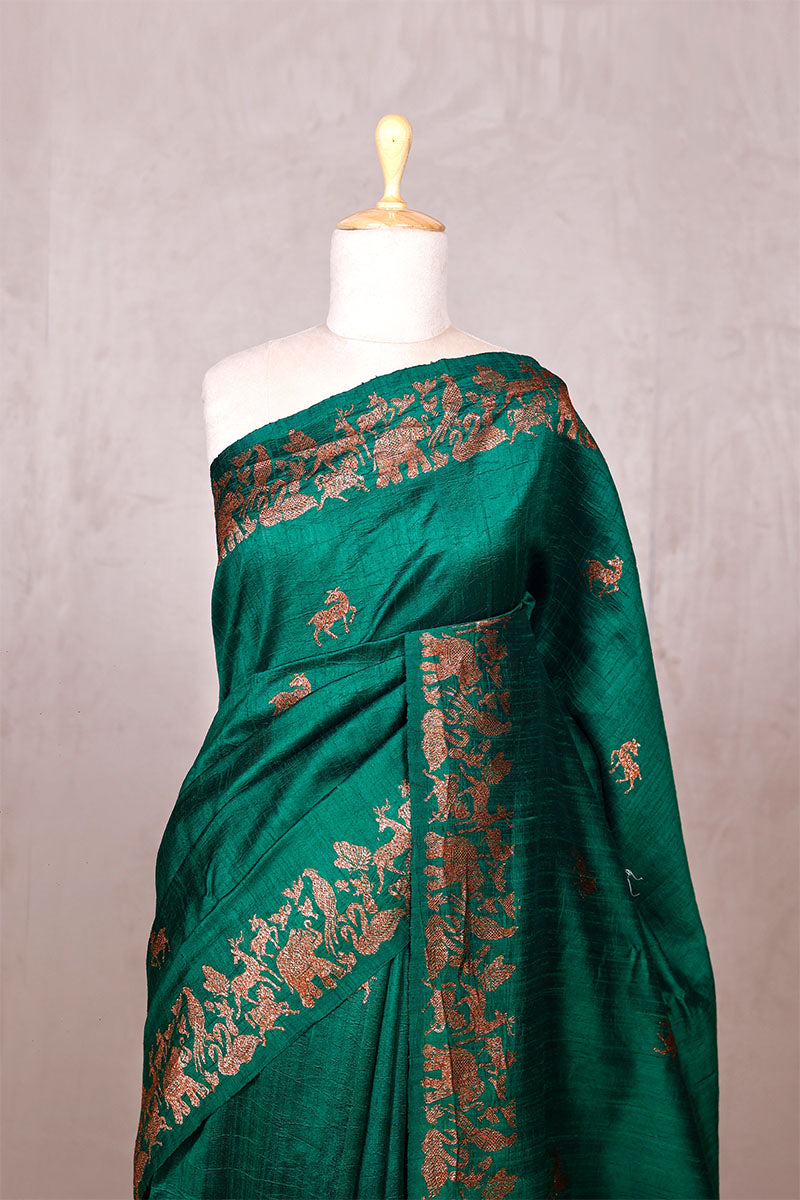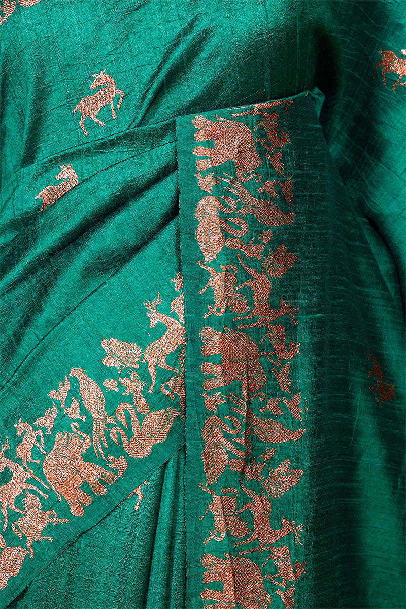 This bottle green Banarasi saree, woven with antique zari deer motifs spread across the body, is classic craftsmanship. The border and pallu are intricately woven with antique zari Shikargah and bird motifs, creating a rich and detailed pattern. It is paired with a contrast unstitched blouse piece, allowing for personalized styling.