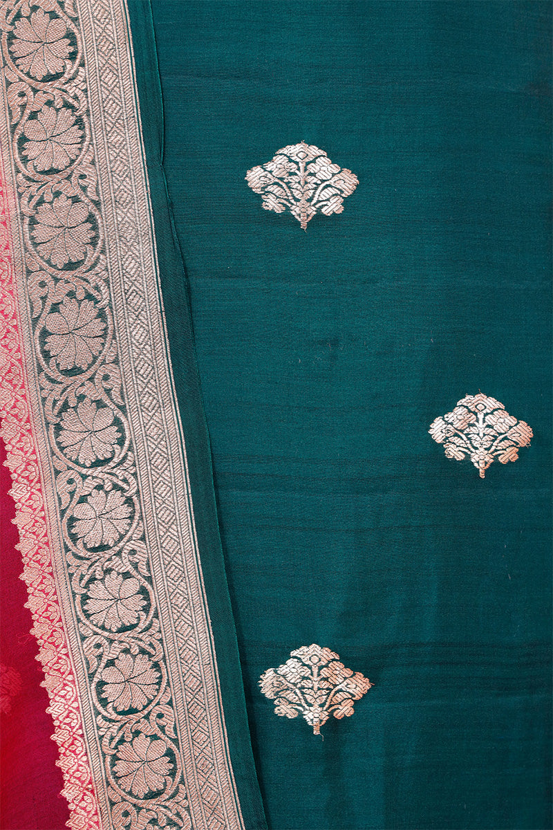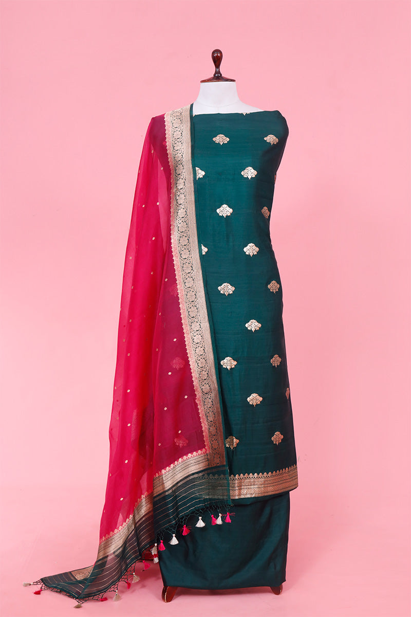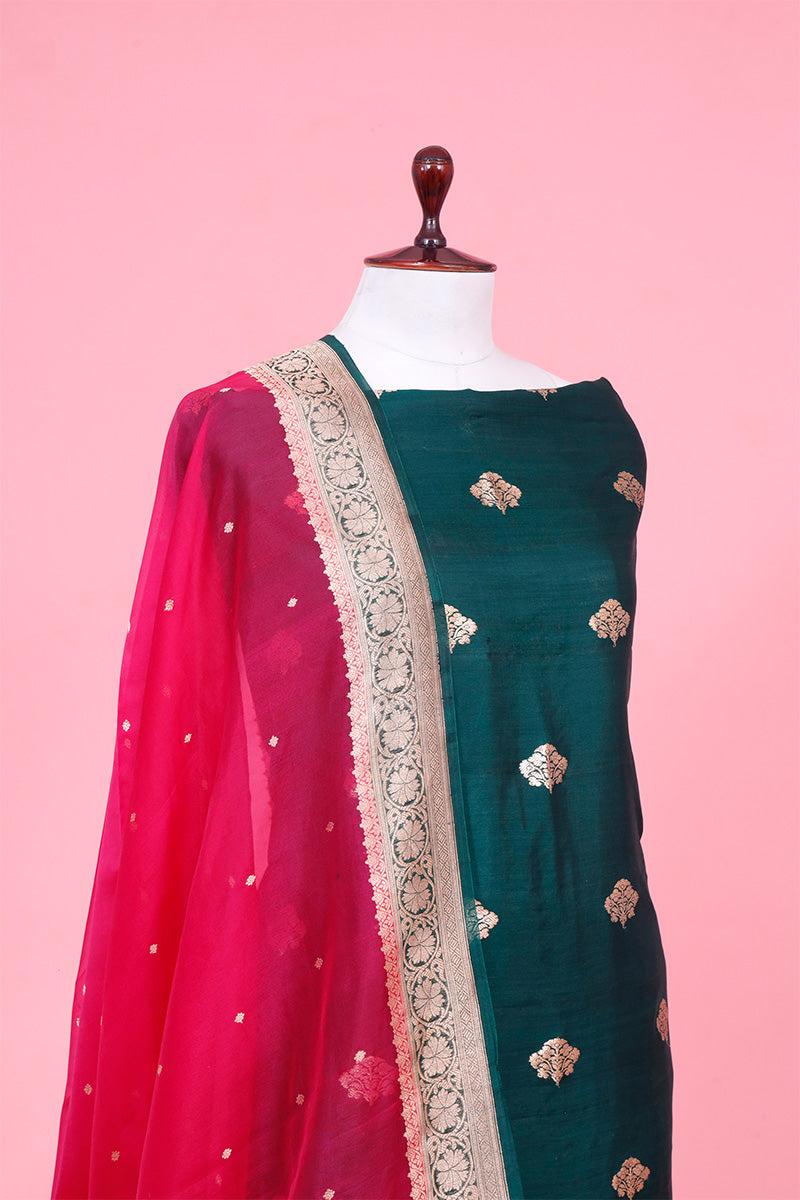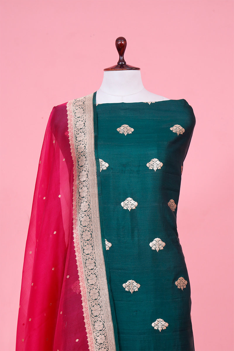 This bottle green Tussar silk suit set is an elegant choice for festive and special occasions. The kurta is adorned with intricate gold Kadhwa woven floral buta, making it a classic addition to your wardrobe.