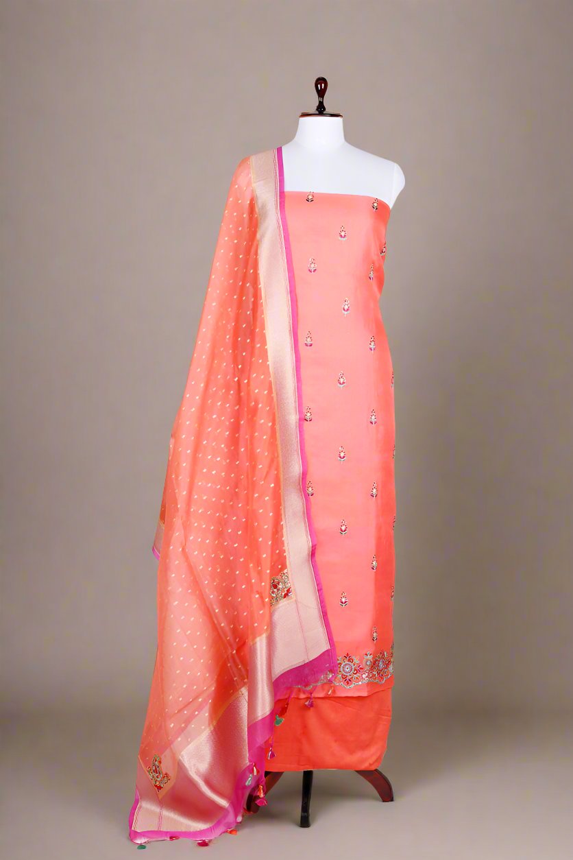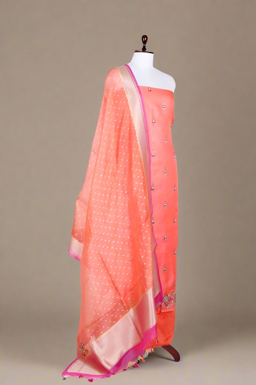 Brick Pink Embroided Organza Silk Dress Material is a woven kurta fabric, Our Organza Silk fabric comes with embellishment with embroidered buta motifs on the kurta piece and an organza silk zardozi embroidered border with paisley motif organza dupatta and the fabric piece also comes with a chanderi silk bottoms to complete the look.